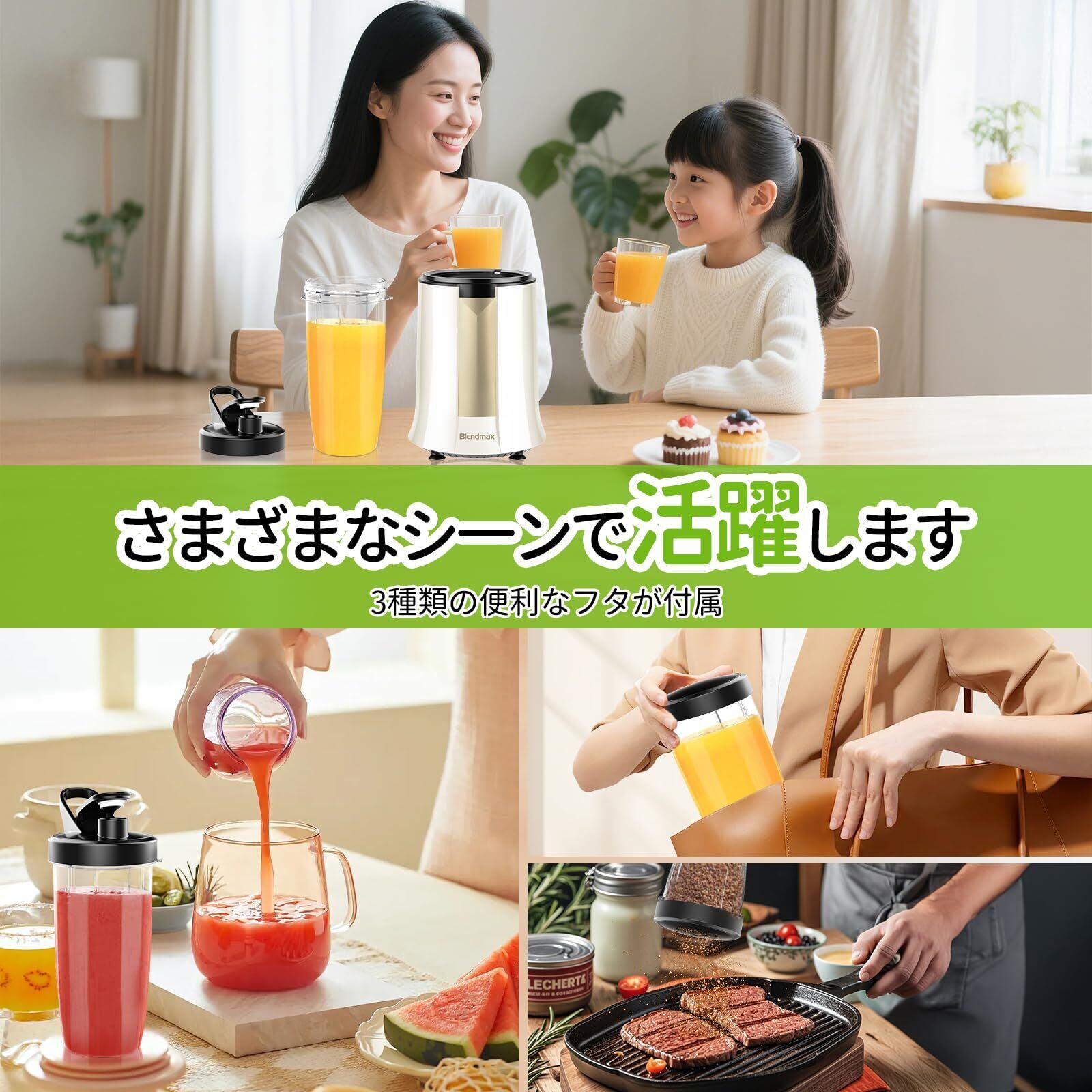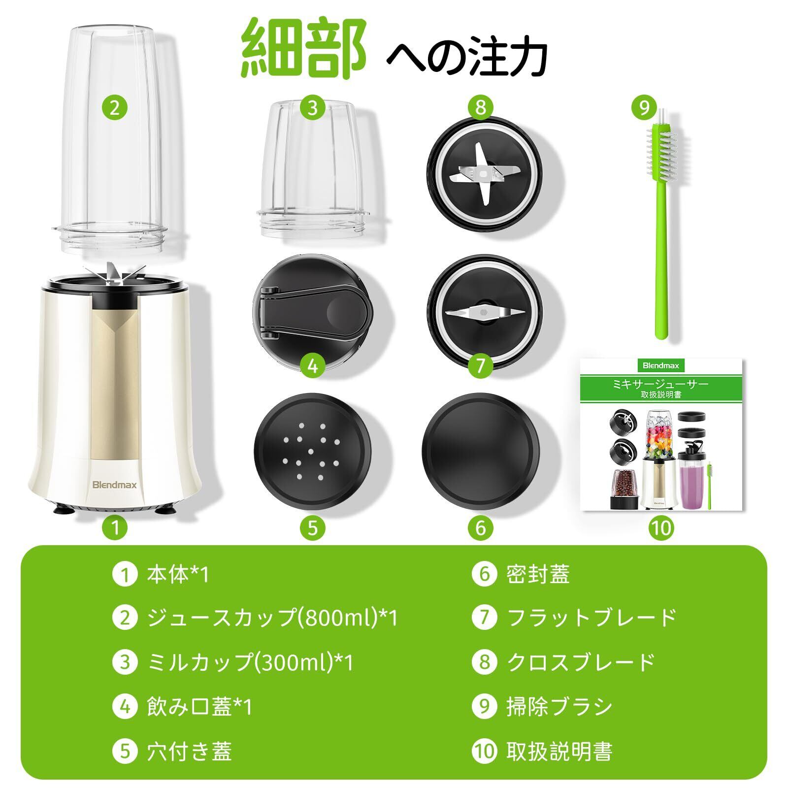 【食品グレード素材&安全設計&パッケージ内容】BPAフリーで無毒・無害な安全素材を使用したミキサーです。モーターは純銅製で、優れた耐久性を誇ります。また、高品質のABS素材を採用しており、耐寒・耐熱性能も抜群です。温度保護機能や誤作動防止の安全装置も搭載しており、安心してご利用いただけます。【フルセットのパッケージ内容】:モーター本体*1、800mLのジュースカップ*1、300mLのミルカップ*1、800mL飲み口カップ*1、6枚刃カッター*1、2枚刃カッター*1、蓋*1、调味料用盖(穴付き)*1、ブラシ*1と日本語マニュアル、合わせて10点のセット付きますキッチン、アウトドア、旅行、出張、ジム、オフィスなど、さまざまな場所で簡単に使用できます。友達や家族へのプレゼント、誕生日、クリスマスギフトなどにも最適です。