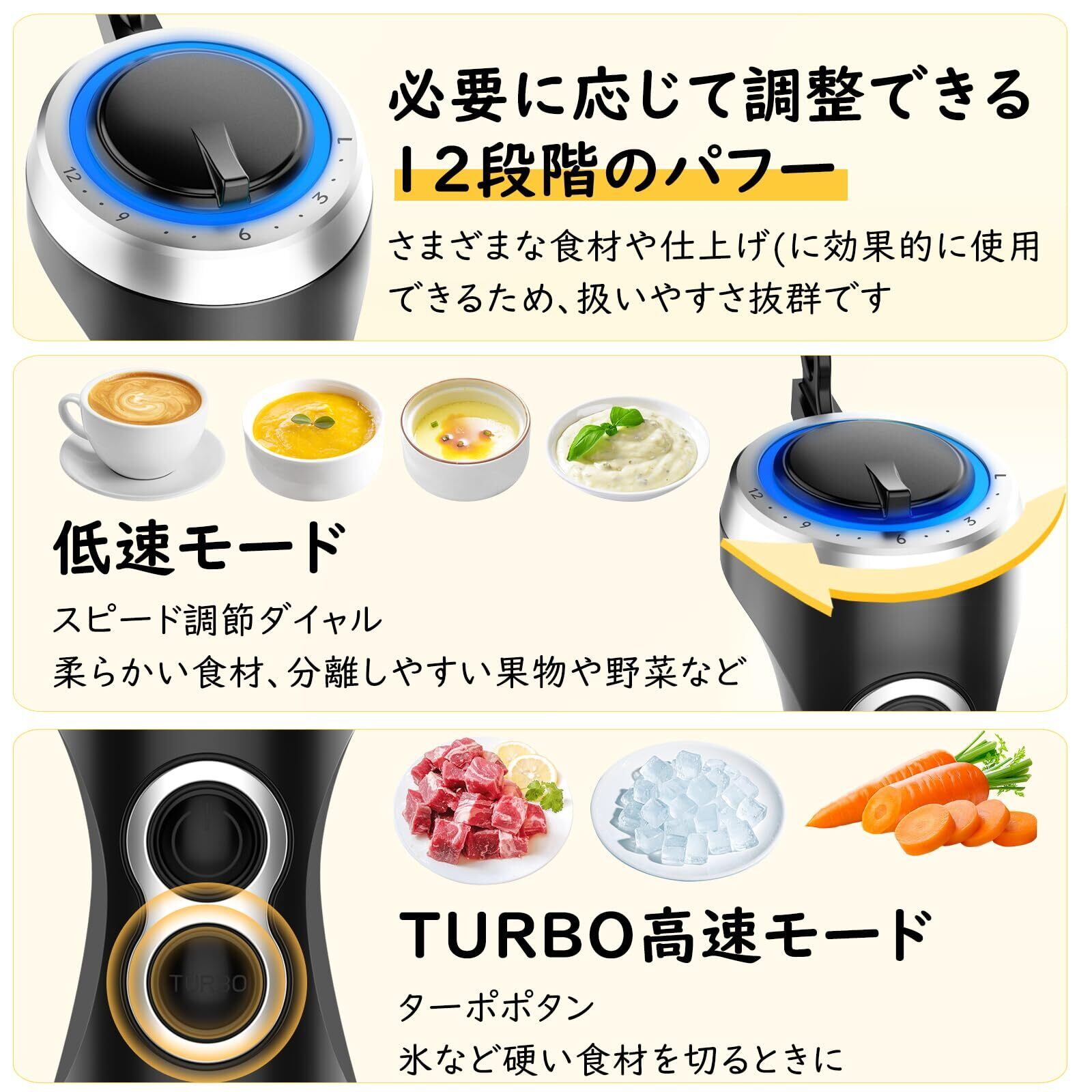 【1台7役、コスパ最高】この多機能ハンドブレンダーは、6種類の異なる使い方ができ、日々の料理を便利にサポートします。「つぶす」「混ぜる」「刻む」「粉砕する」「かき混ぜる」「泡立てる」「卵を泡立てる」と、幅広い調理シーンに対応。人間工学に基づいた設計で、若い女性でも簡単に操作可能です。食品のブレンド、スープ作り、調味料やベビーフードなど、あらゆる料理に活躍します。さらに、4つの異なるアタッチメントが付属しており、これらを本体と組み合わせることで、手軽に7つの機能を使い分けることができます。