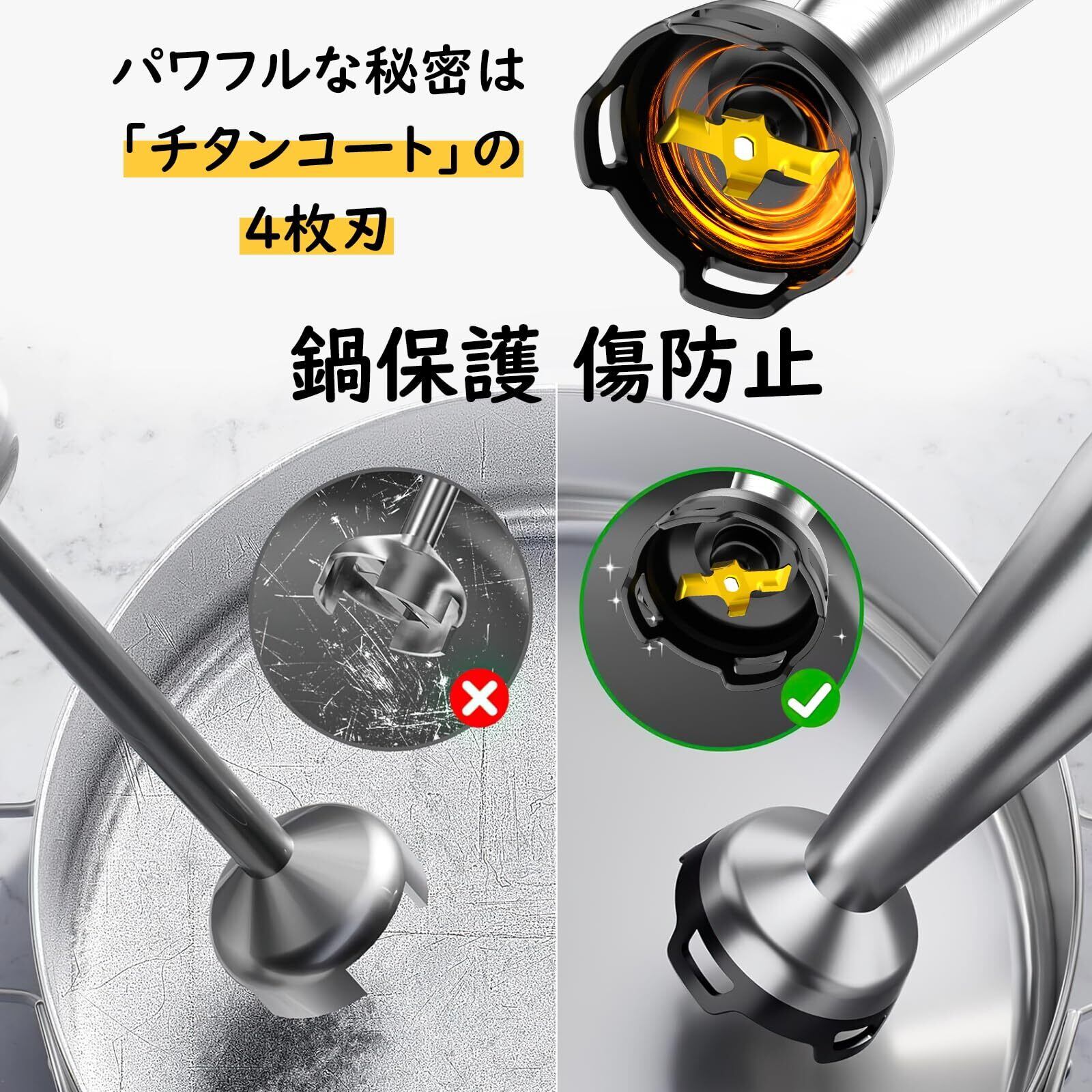 【最新鋭のチタンコーティング刃設計】このハンドブレンダーは、最新のチタンコーティング刃先を採用し、耐久性と切れ味が向上。食材を効率的に処理できるだけでなく、耐腐食性にも優れ、長期間使用しても錆びにくく衛生的です。さらに、刃先にはシリコンエッジが施されており、キッチン道具やボウルを傷つけることなく、摩擦を減少させて滑らかな切り分けが可能です。また、飛び散り防止設計により、調理中の食材や液体の飛び散りを防ぎ、クリーンで快適な調理環境を保ちます。これらの機能により、どんなに速く回転させても安心して使用でき、後片付けも簡単です。