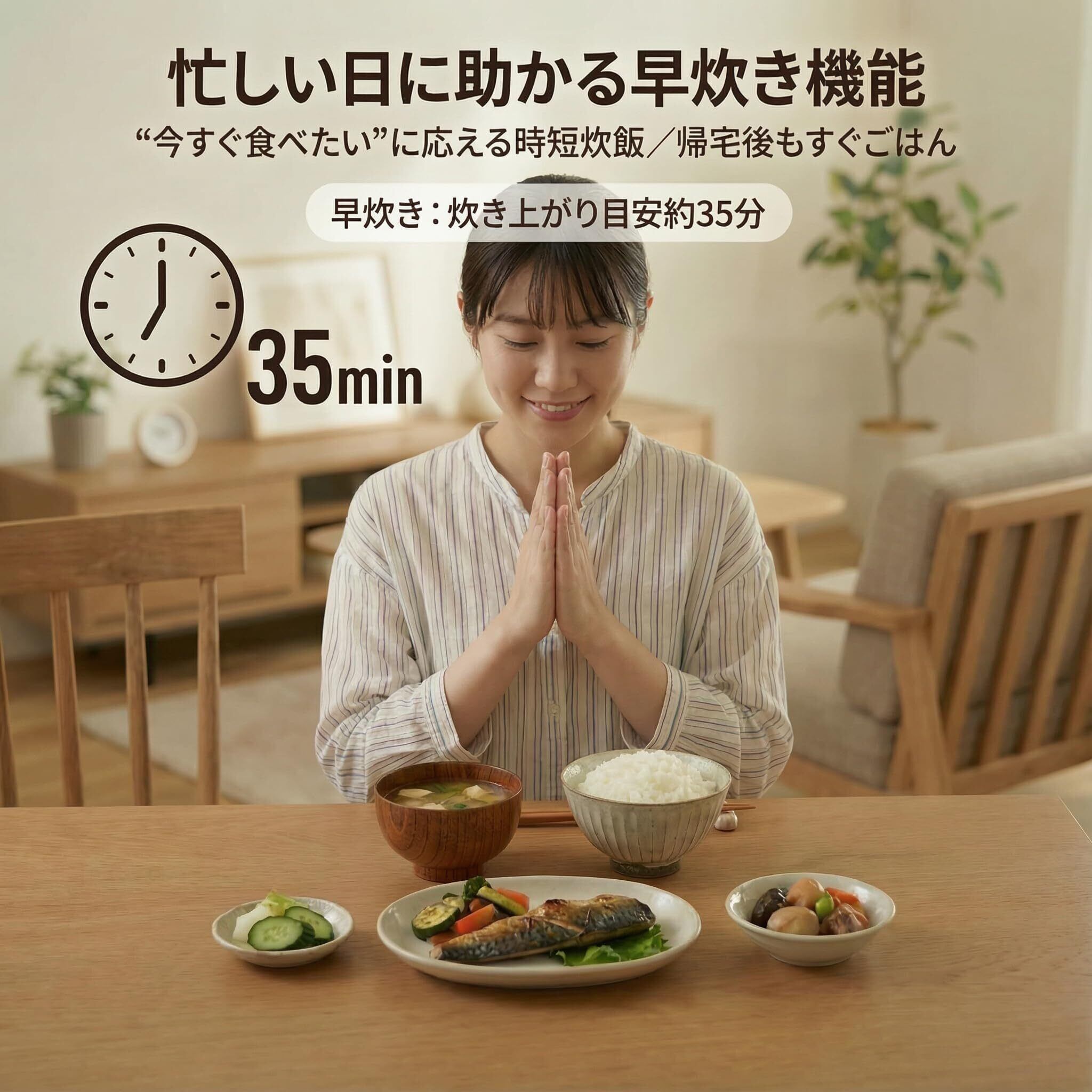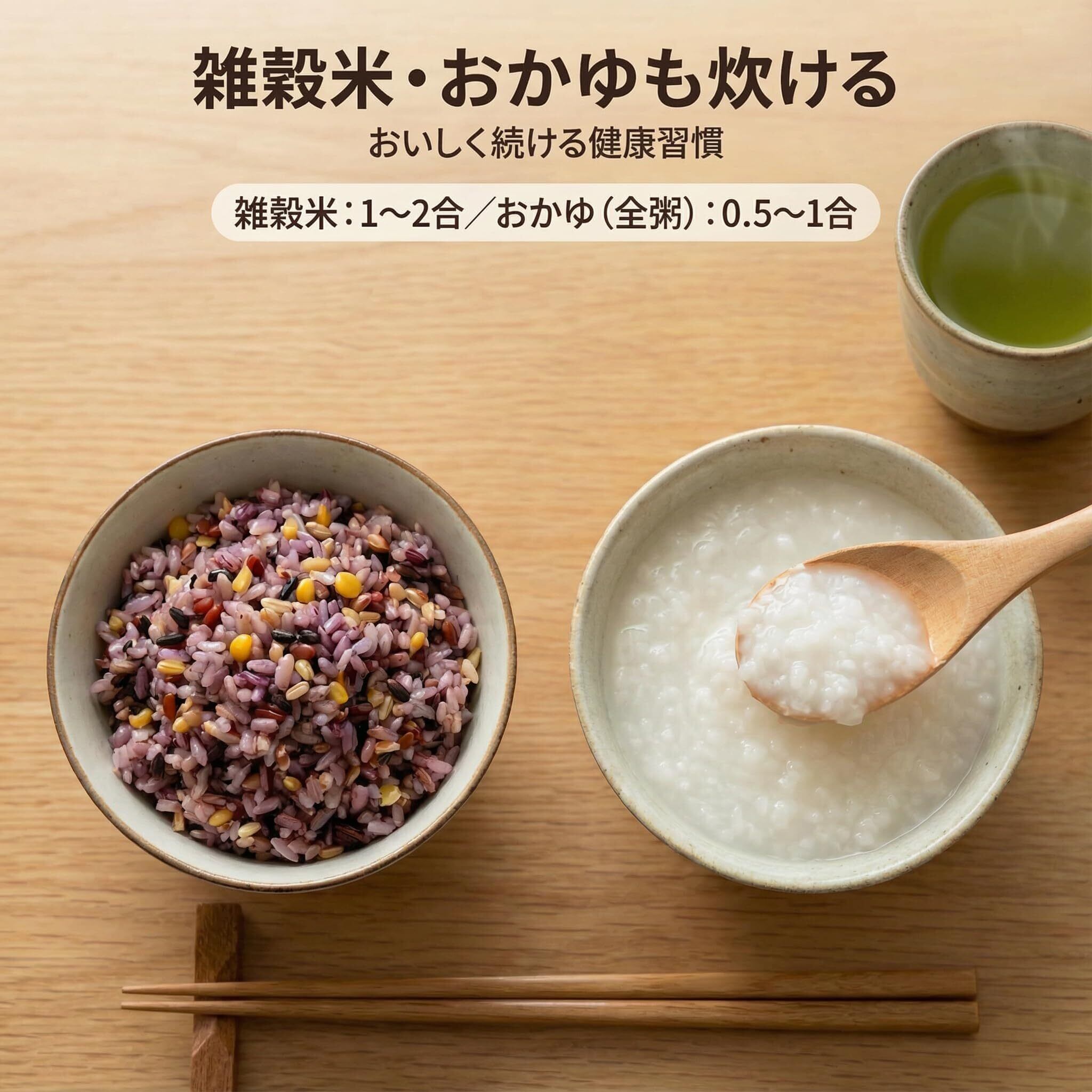 【便利メニュー5種】白米/無洗米/早炊き/雑穀米(1〜2合)/おかゆ(全粥0.5〜1合)を搭載。早炊きは約35分で炊き上がり、忙しい日も時短でごはん。