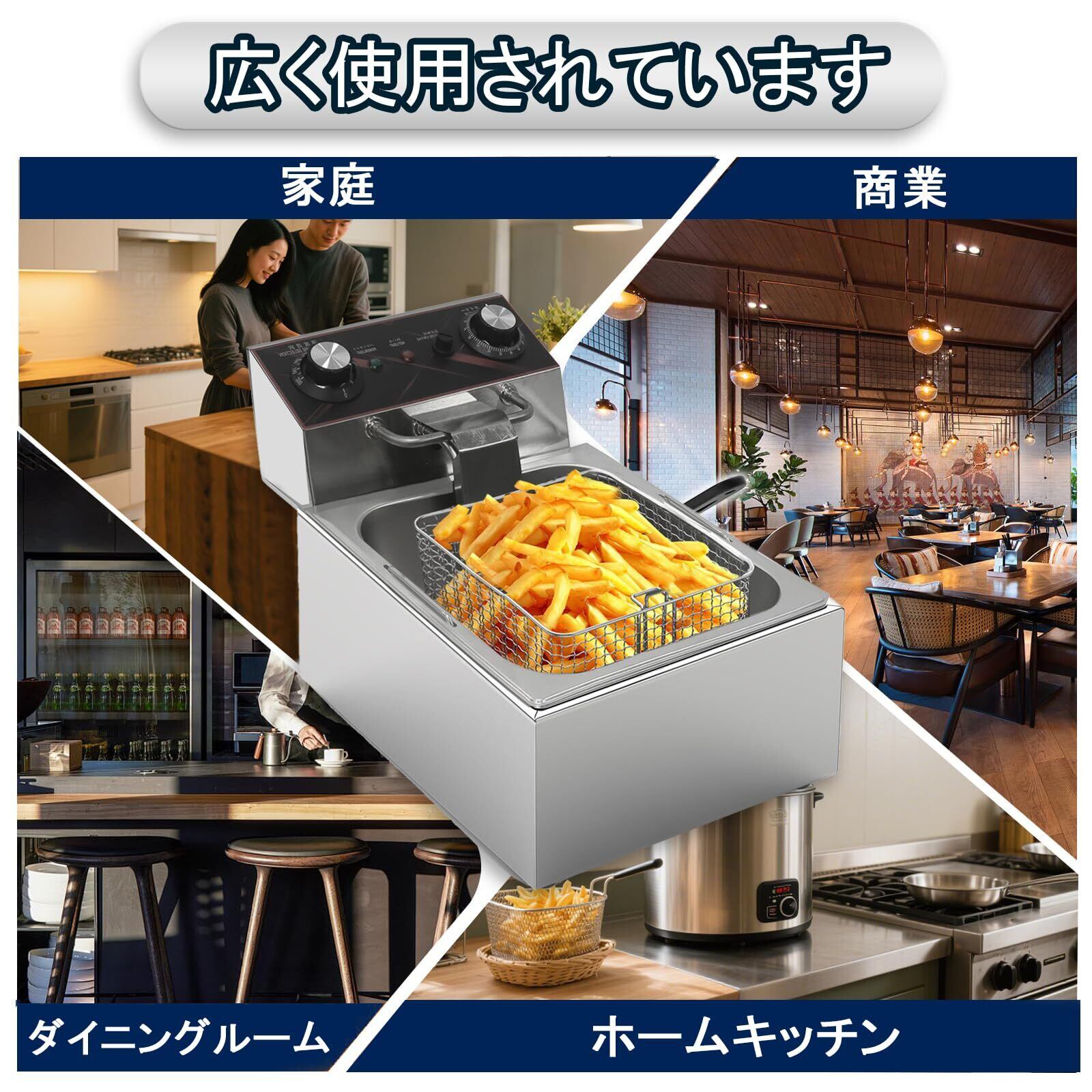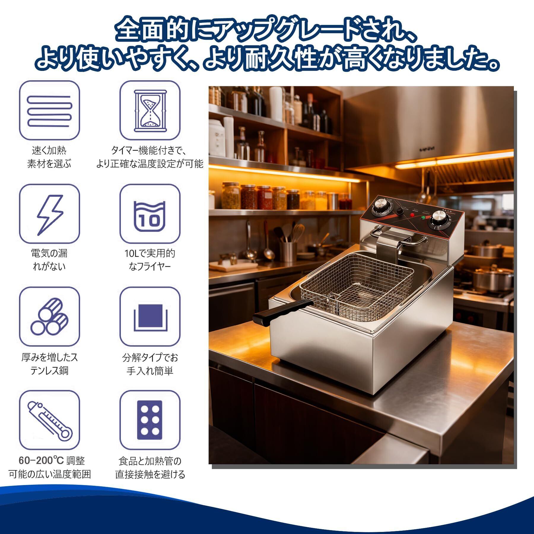 電気フライヤー 家庭用 ステンレス製 10L 大容量 温度調節 タイマー付き 業務用も可 揚げ物 天ぷら 日本語説明書付き