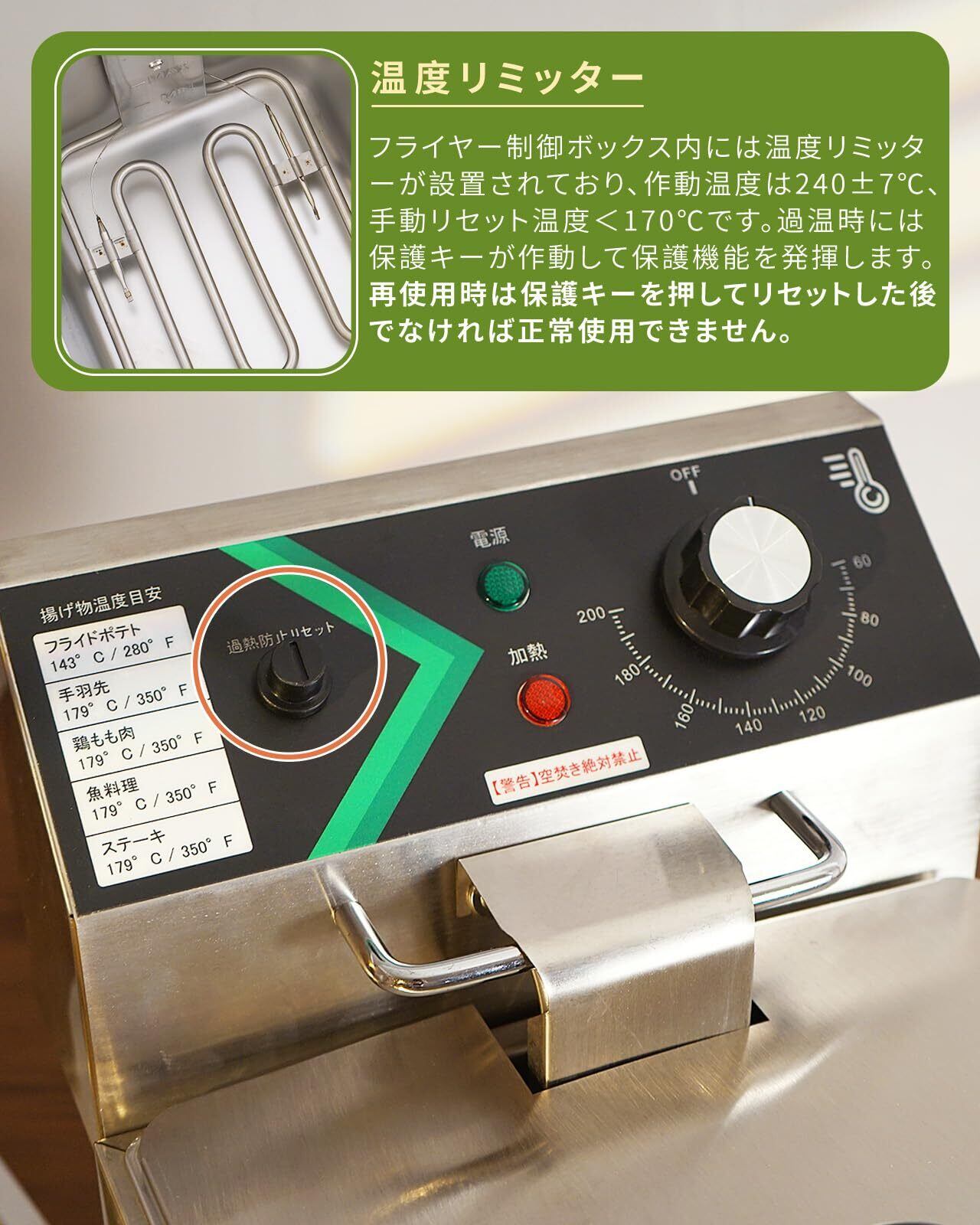 【過熱保護装置】フライヤー制御ボックス内には温度リミッターが設置されており、作動温度は240±7℃、手動リセット温度<170℃です。過温時には保護キーが作動して保護機能を発揮します。再使用時は保護キーを押してリセットした後でなければ正常使用できません。