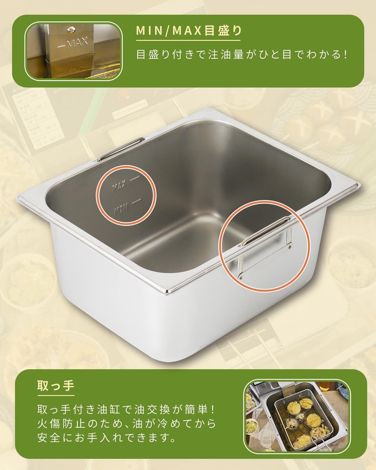 【業務仕様の細かい気配り】内釜には取っ手と油量の目安となるmin/maxラインを設置。熱い釜の移動も、適切な油量の管理も、ストレスなく行えます。また、日本のコンセント(100V)にそのまま差し込める2ピンプラグです。