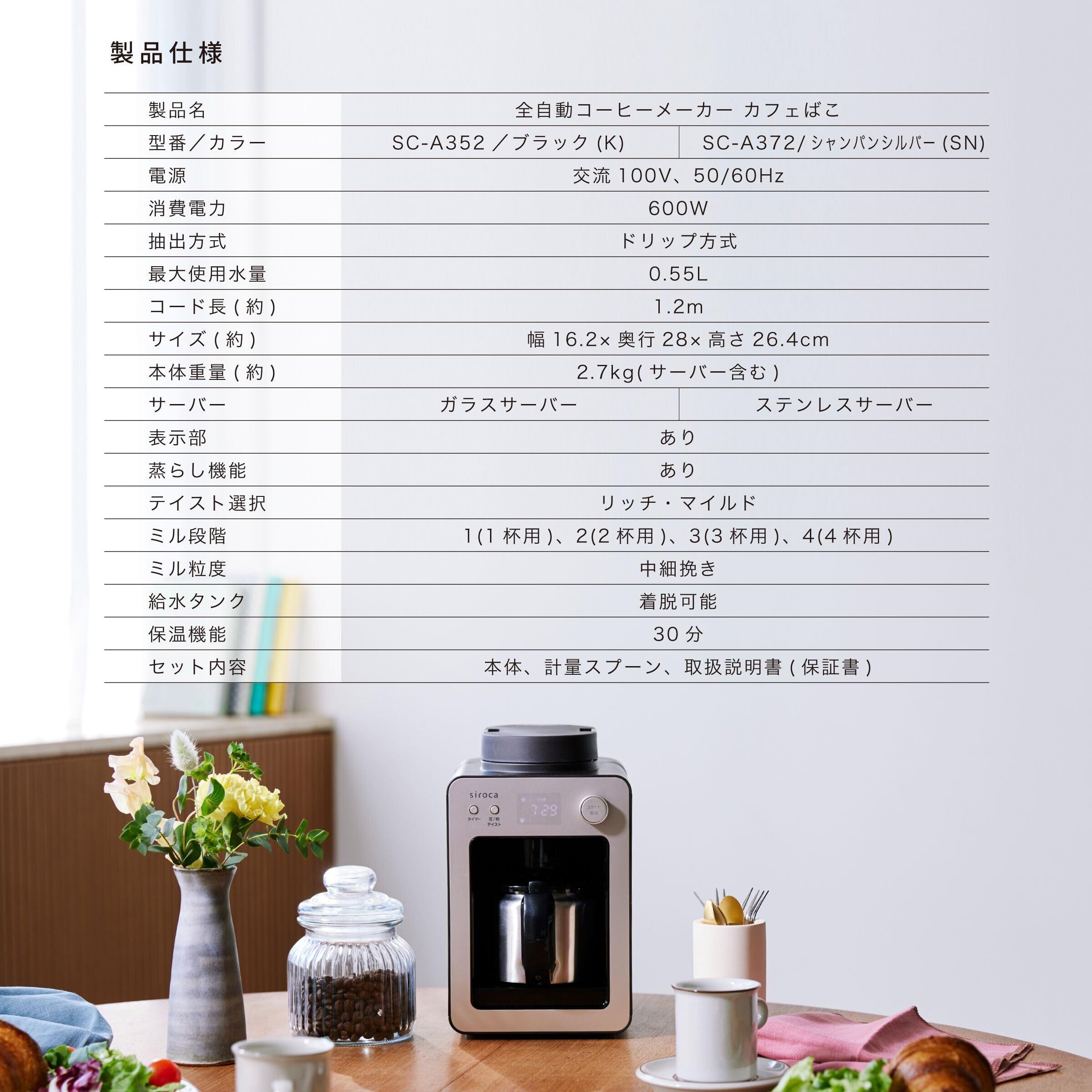 【数量限定】シロカ 全自動コーヒーメーカーカフェばこ SC-A372 シャンパンシルバー [ステンレスサーバー/コンパクト/豆・粉対応/ミル内臓/タイマー予約/保温機能付き/メッシュフィルター/おしゃれ](2024年モデル)
