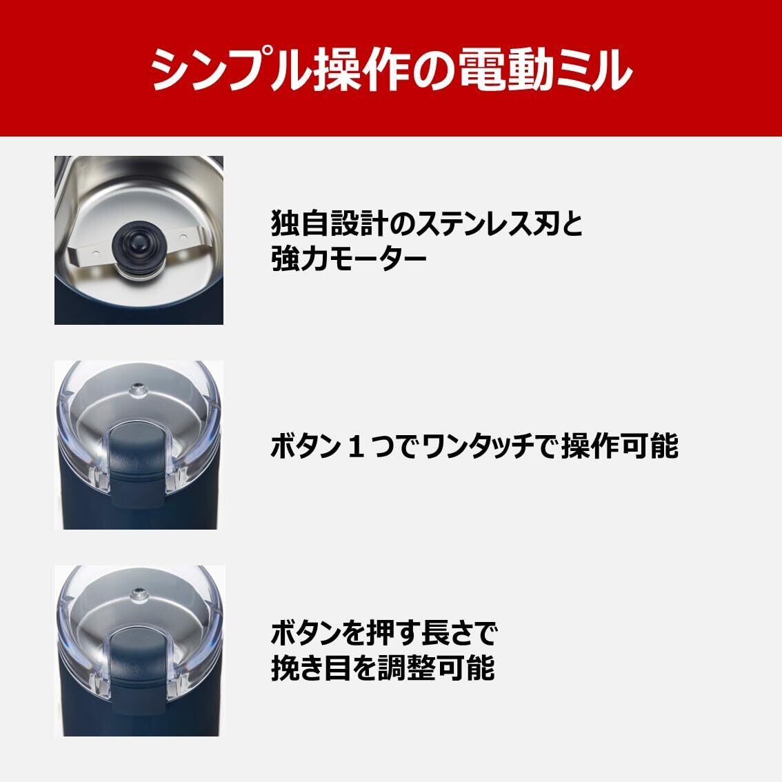 - ボタンを押す長さで,挽き目を調整可能