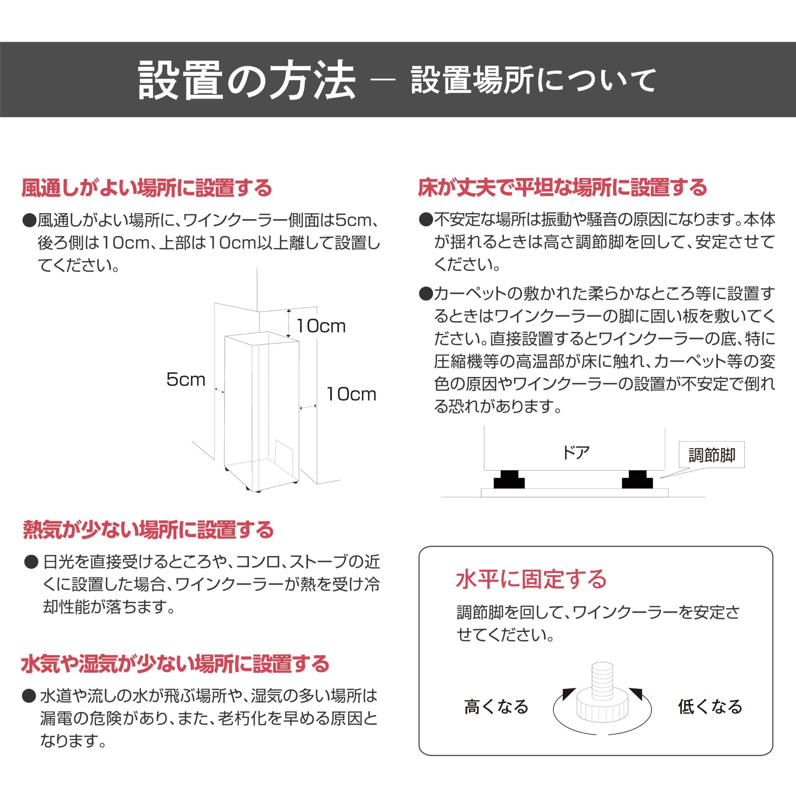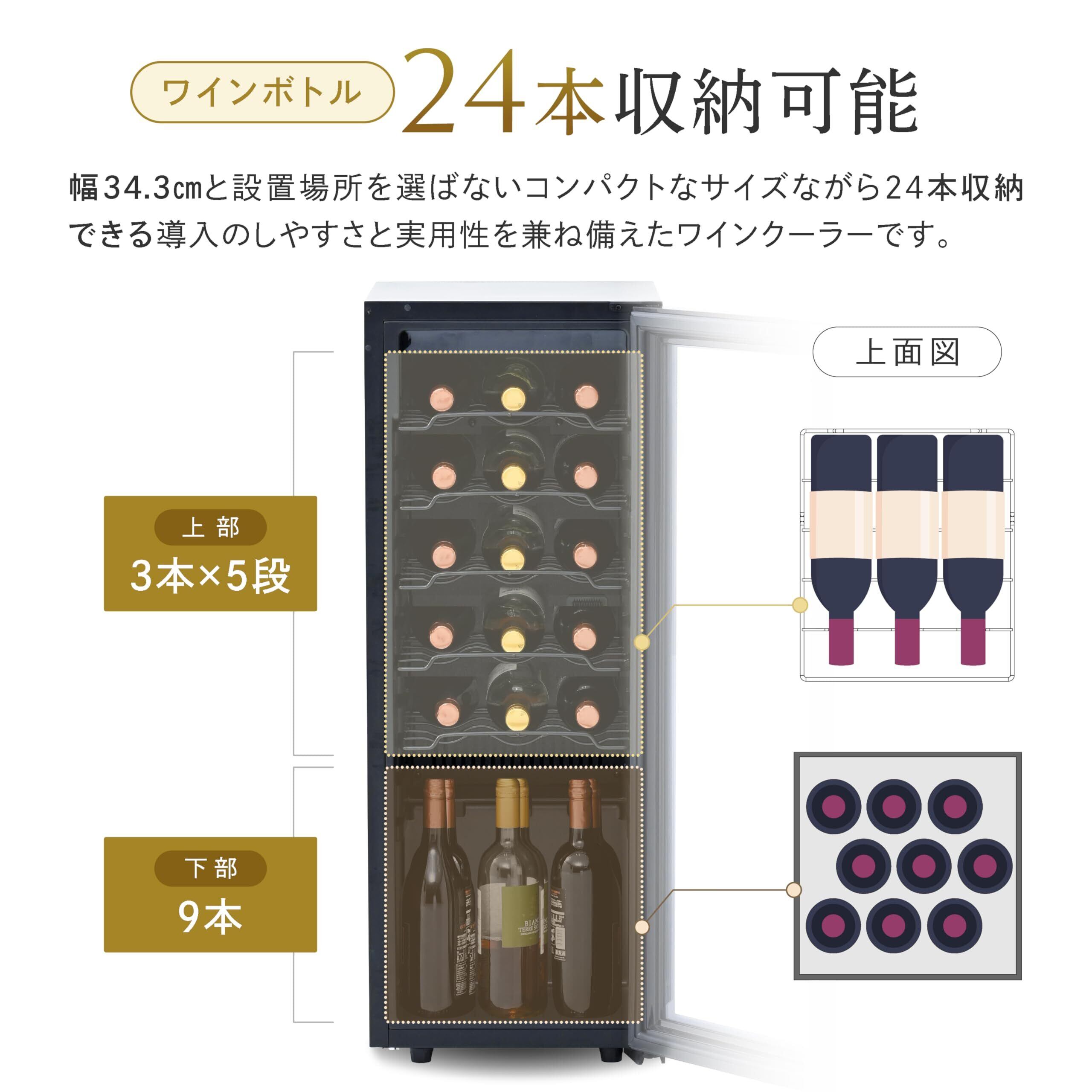 【商品仕様】▪本体サイズ:幅34.3×奥行47.5×高さ89.2㎝ ▪定格電圧:100V~ 50/60Hz ▪定格内容量:60L ▪温度範囲:5~20℃ ▪収納本数(ワインボトル):24本(5棚) ▪期間:お買い上げ日より1年間(の範囲については、取扱説明書をご確認ください。(一般家庭用以外(業務用など)に使用された場合の故障及び損傷などは対象外となります))