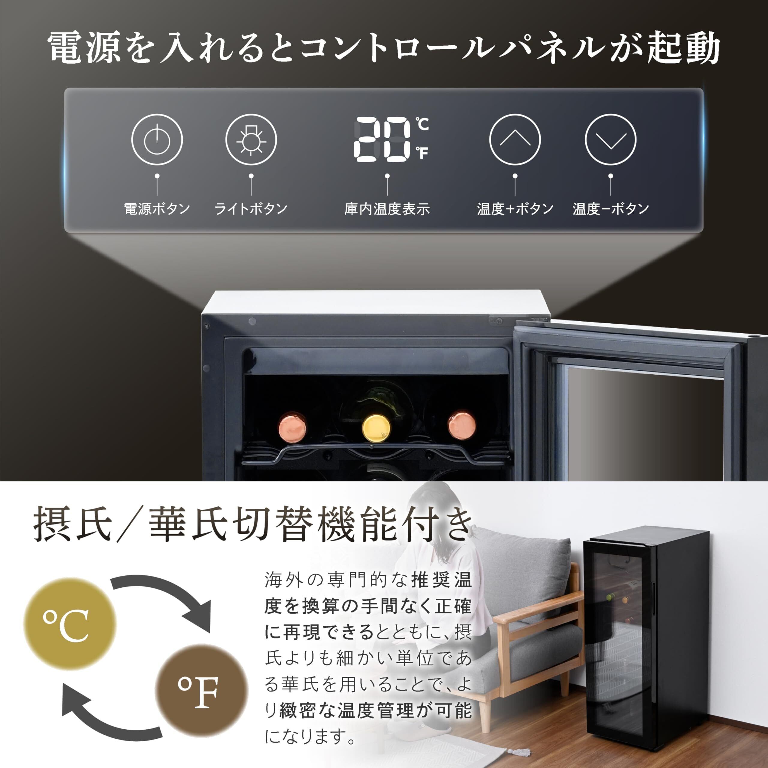 【精密温度管理&切替表示】 5℃~20℃の温度設定に対応し、ワインの種類や飲み方に合わせて1℃単位で精密に管理。摂氏(℃)/華氏(℉)の表示切替も可能で、利便性も抜群です。