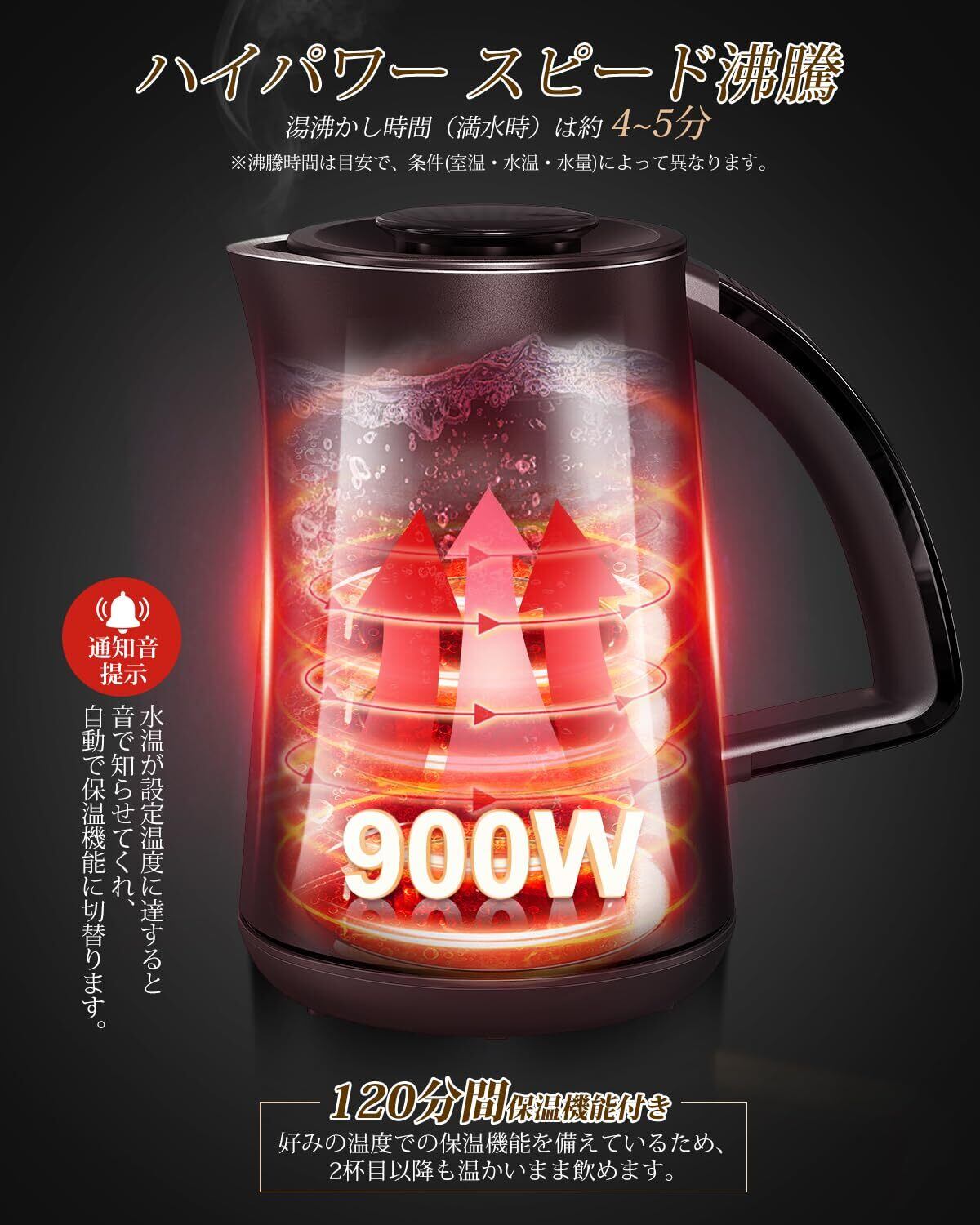 【900Wスピード湯沸かし・2時間保温機能】湯沸かしケトルは900Wのハイパワーにより、満水時(800ml)でも約3〜5分と素早く沸騰させます。※室温25℃、水温25℃の場合。沸騰時間はあくまで目安で条件(室温・水温・水量)によって異なります。設定温度になると、ケトルが「ピーッ」と音で知らせ、自動で保温機能に切り替わります。120分の保温機能を備えているので、2杯目のお茶やコーヒー、スープも再沸とうの必要がなくすぐに楽しめます。