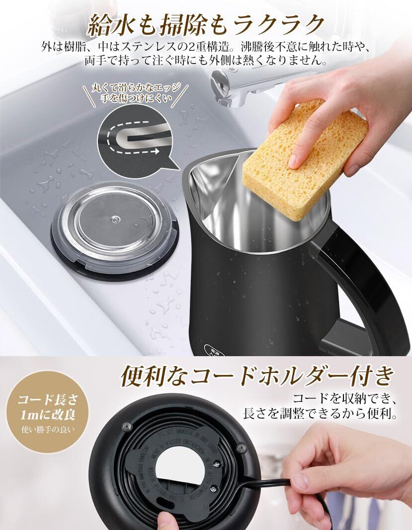 【コードホルダー付き・広口設計】電気ポットは従来品より電源コード長さは0.8M⇒1.3Mに改善し汎用性が高くて便利です。便利なコードホルダーも付き、コードを収納でき、長さを調整できるから便利(※コードを完全に収納することはできません)。ふたが取り外しできて、広口10CM設計なので水を入れやすいのはもちろん、内側のお手入れも簡単にできます。