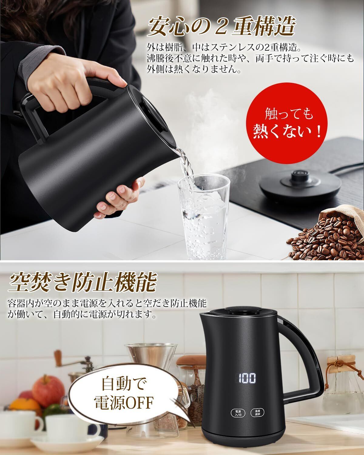 電気ケトル 電気ポット 小型 7段階温度調節 0.8L 一人暮らし 二人暮らし 湯沸かしケトル ディスプレイ 900W 2時間保温 二重構造 触れても熱くない 急速沸騰 空焚き防止機能 熱湯 お茶 ミルク コーヒー マットな質感 木目柄 ブラック PSE認証済み (ブラック)
