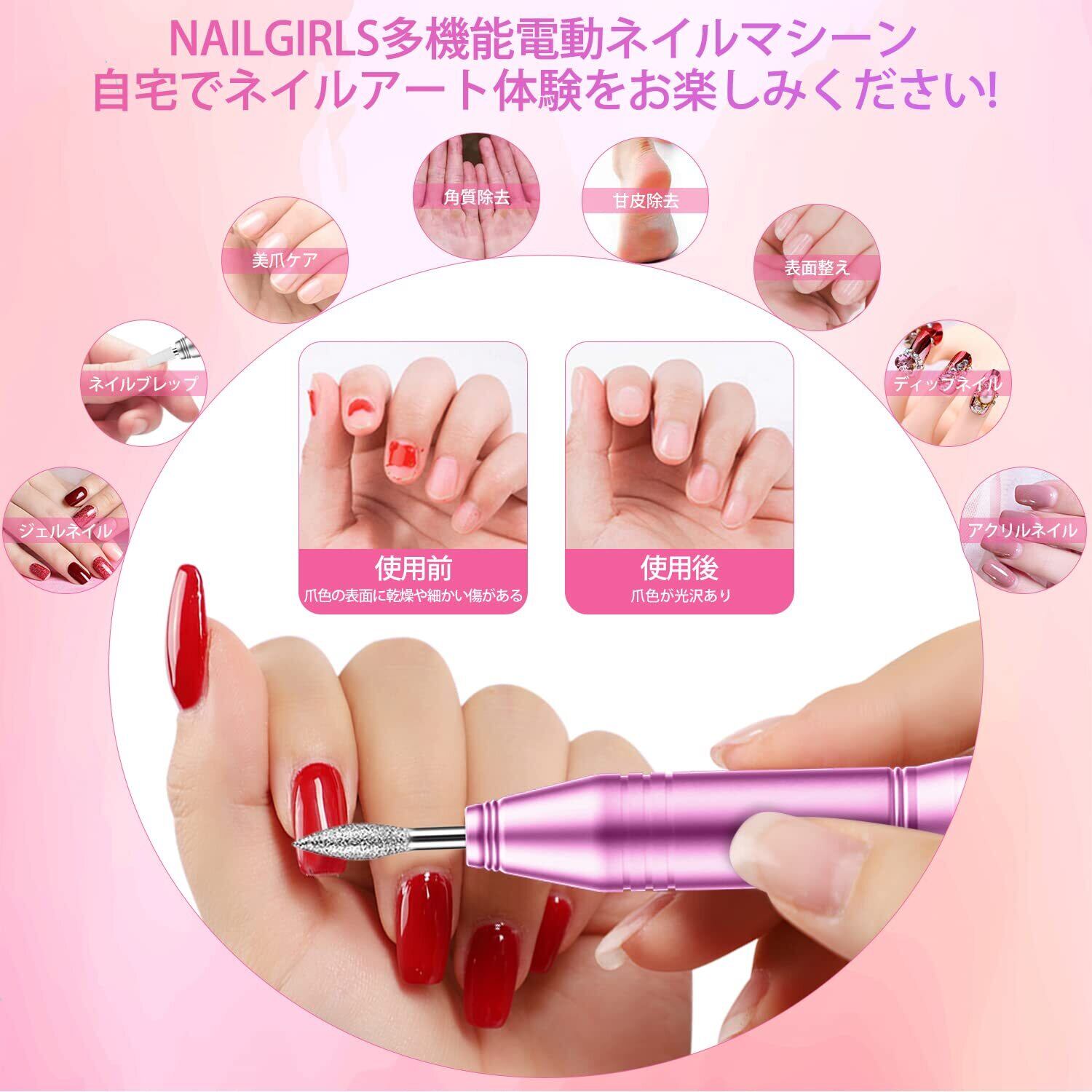 【ネイリスト推薦】 NAILGIRLS 電動ネイルマシン 11個のビット ネイルマシン ビット ジェルネイル オフ キット ネイルケア 爪磨き 甘皮処理 甘皮ケア 正逆回転 無段階変速 USB給電 自宅サロン用(ピンク)