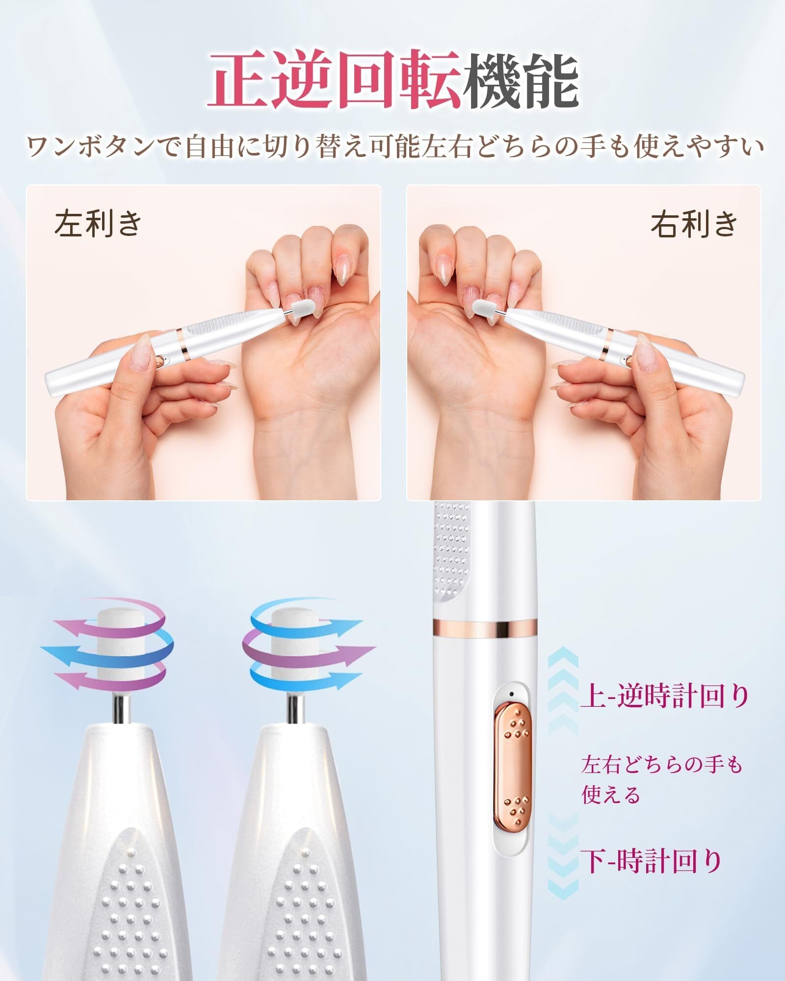 【最大15000 RPMまで!回転速二段階調節!】ネイルマシンの回転速が0-15000 RPMの範囲で調整でき、初心者でもケガをする恐れなく使用でるネイルマシンです。用途や利き手に応じて正逆転換を自在調節でき、左手右手の両方のネイルオフにぴったりです。※初心者は回転数を徐々に上げていく方がお勧めです。