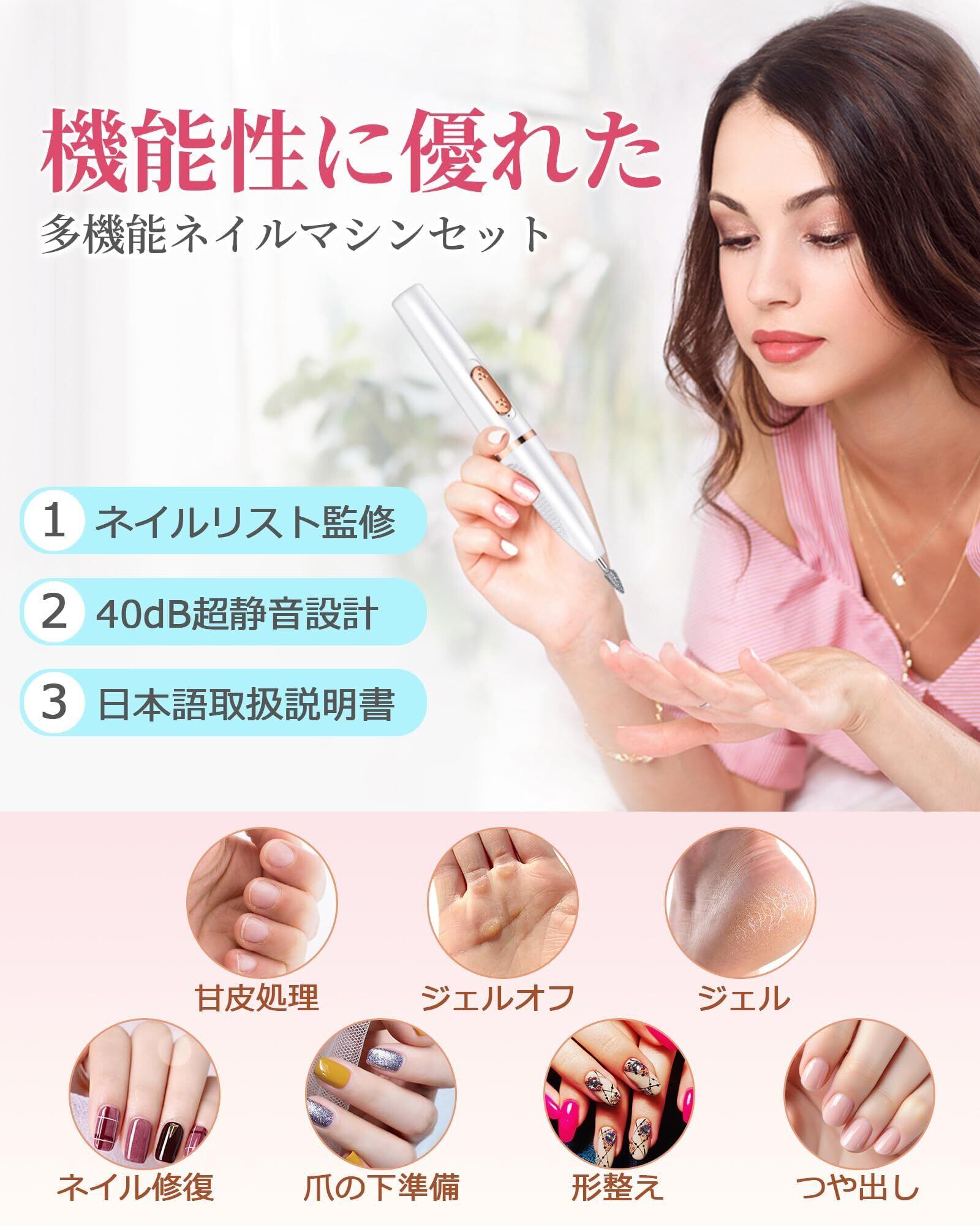 【専用ビット11種類!多機能ネイルマシン!】多機能ネイルマシンは専用11個ビットとサンディングバンド26個を付属し、爪の下準備、カット、ジェルオフ、長さ/厚み/先端の形整え、つや出しなど、これ一つですべて対応できます。日本語説明書付き、ビットを付け替えもスムーズに、自宅で手軽くにネイルチェンジを楽しめます。
