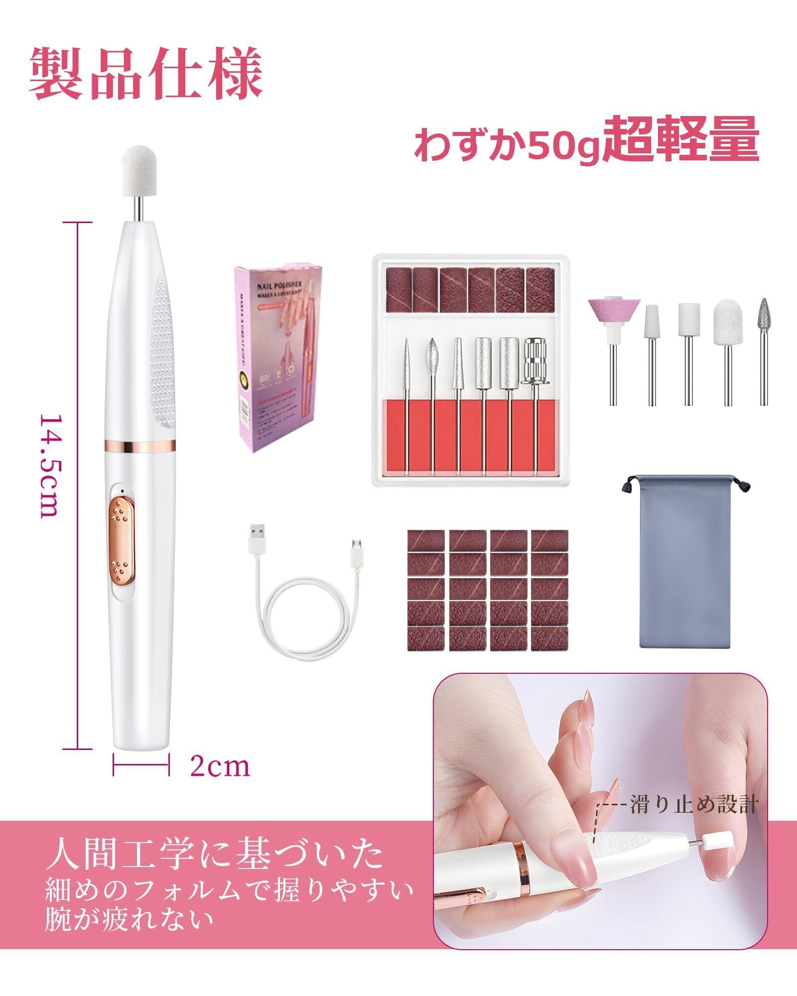 【騒音も放熱もなし!】削りたい箇所にしっかりとフィットします。本体も軽量で長時間使用してもで腕が疲れない。アルミ合金製ビットが切り味抜群、ムラなく均一に削れます。不気味な振動、機械音や摩擦熱を一切感じないので、手軽に使える本格的なネイルマシンです。