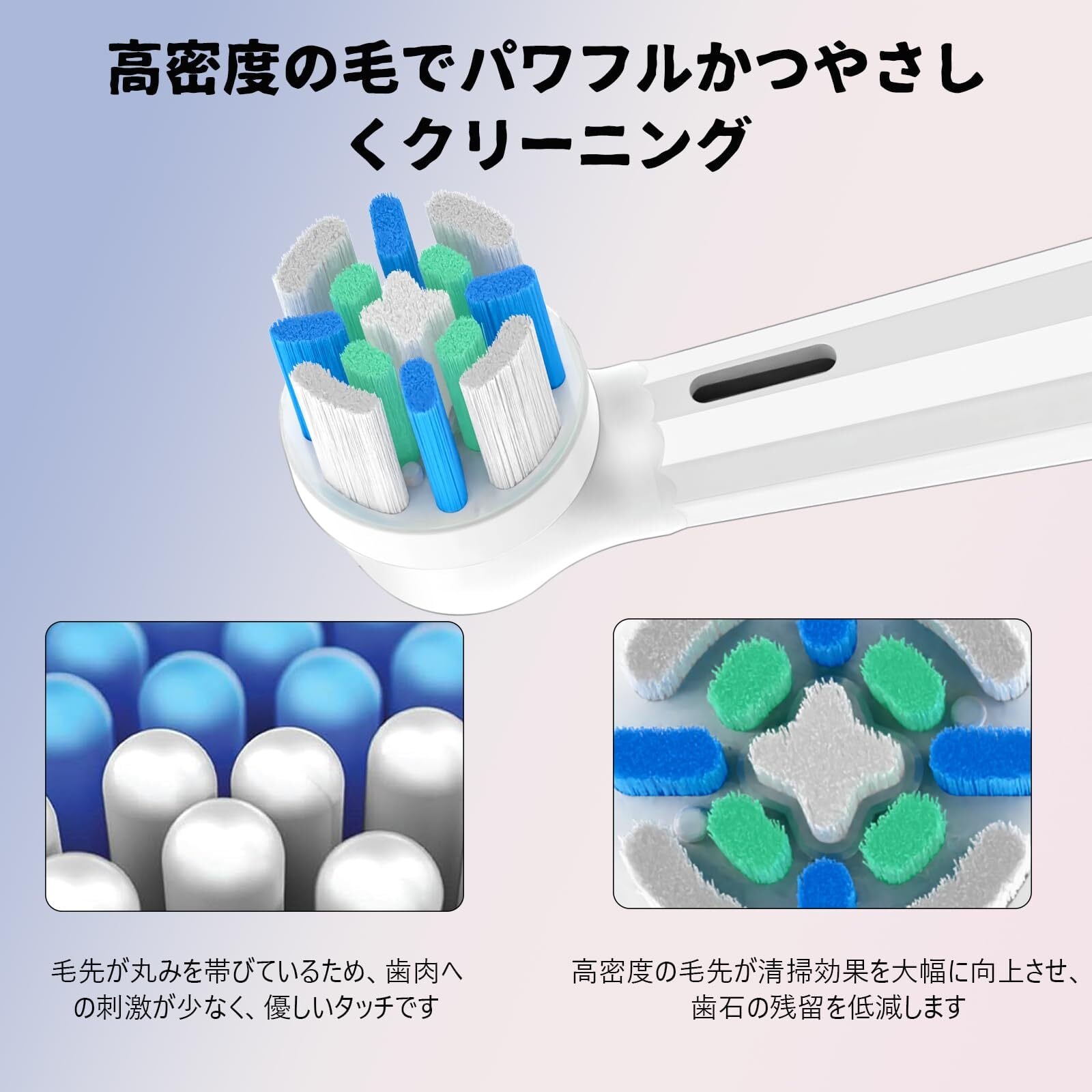 高密度&中硬度毛:毛先が丸く滑らかで、中硬度の高密度毛を厳選。歯ぐきへの刺激を抑え、快適なブラッシングを実現します