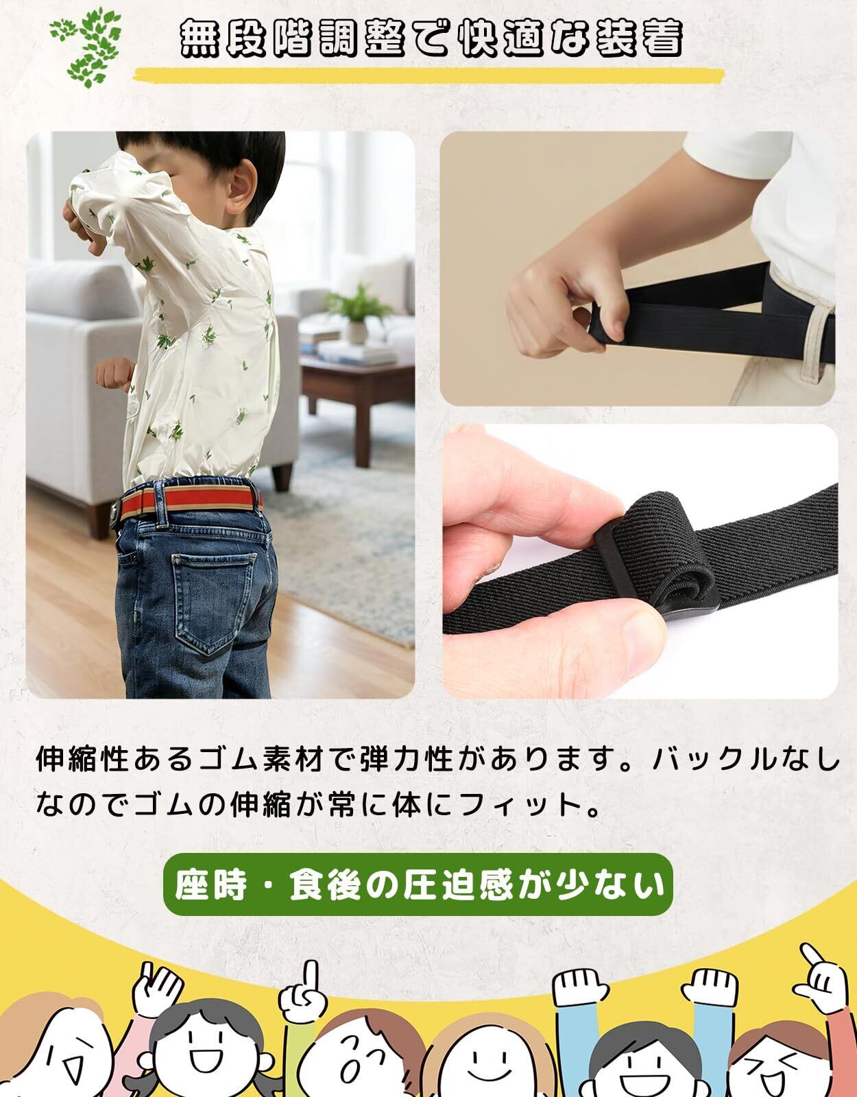 【一人でできたを応援するゴムベルト】バックル操作が不要。ズボンの上げ下げがスムーズで、トイレも着替えもお子様一人で完結。幼稚園保育園・小学校での「間に合わない」を防ぎます。