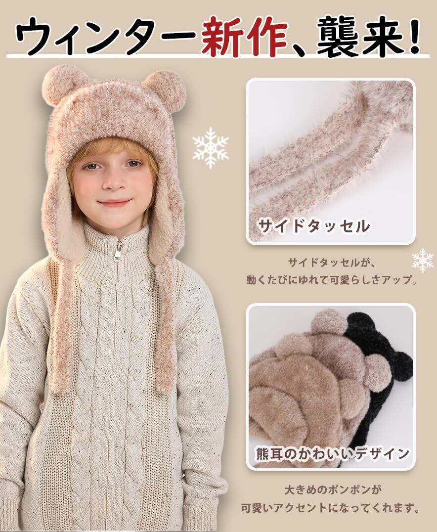【在庫セール】[LeafIn] 子ども ニット帽 キッズ 男の子 キッズ ニット 耳あて 帽子 クマ ニットキャップ スノボー スキー 子供 防寒帽子 冬 こども ニット帽子 モコモコ 4-10歳 49-56cm 2220