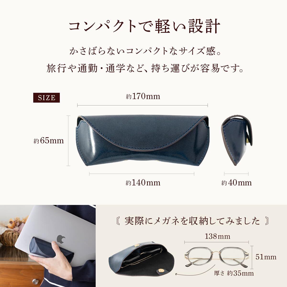 【商品サイズ】 ・縦 65mm × 横 170mm × 厚み 40mm ・重さ 45g 【素材】 ・表側:本革 イタリアンレザー ・内側:ナイロン ポリエステル 【対応メガネサイズ】 縦 5.5cmまで ・横 13.5cmまで ・厚み 3cmまで