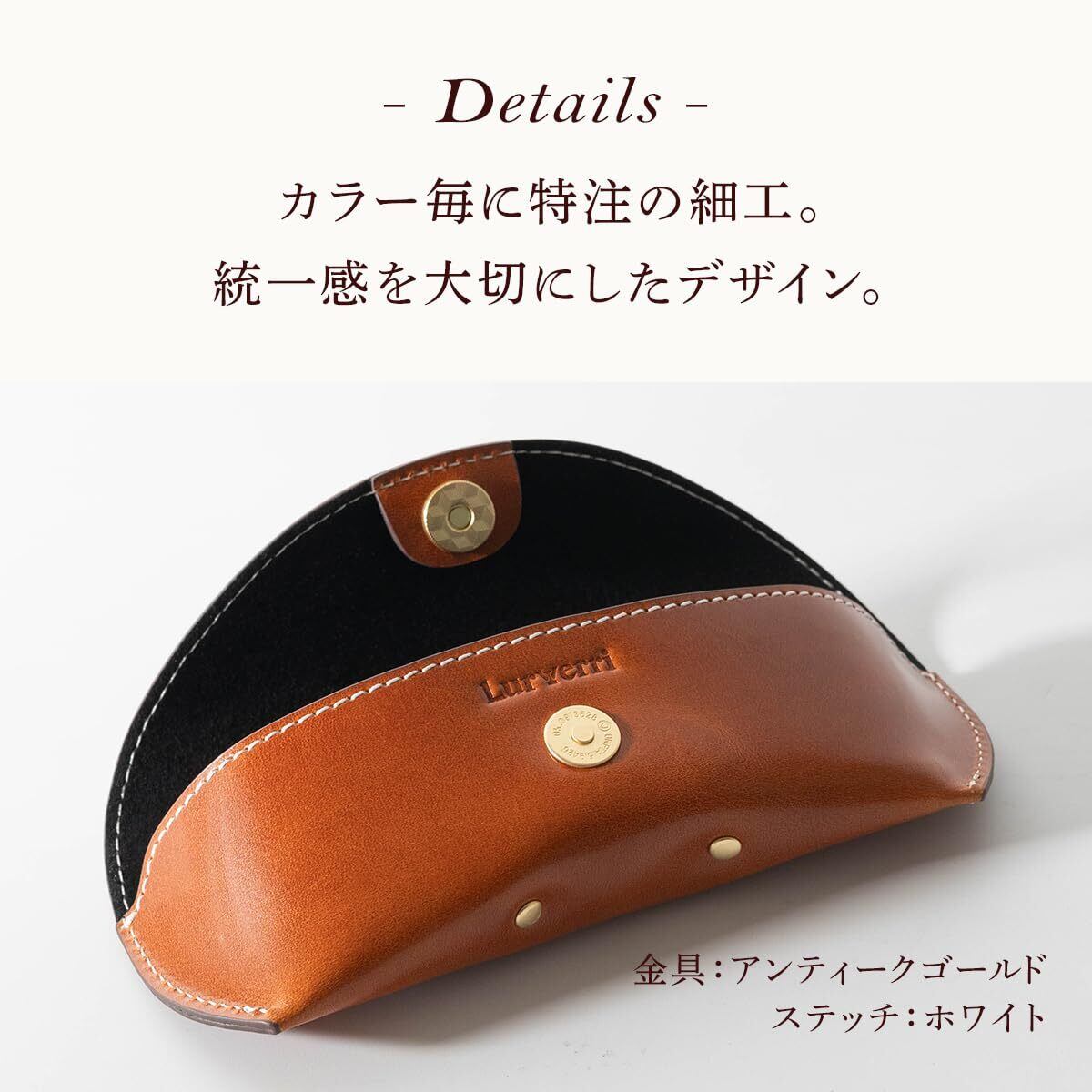 【細部までこだわった職人仕上げ】 オイルレザーのハリ感を活かした美しい曲線。マグネットボタンで開閉もスムーズ。内側は優しい手ざわりのスウェード調生地で仕上げました。台座が付いているので、メガネがしっかり安定します。