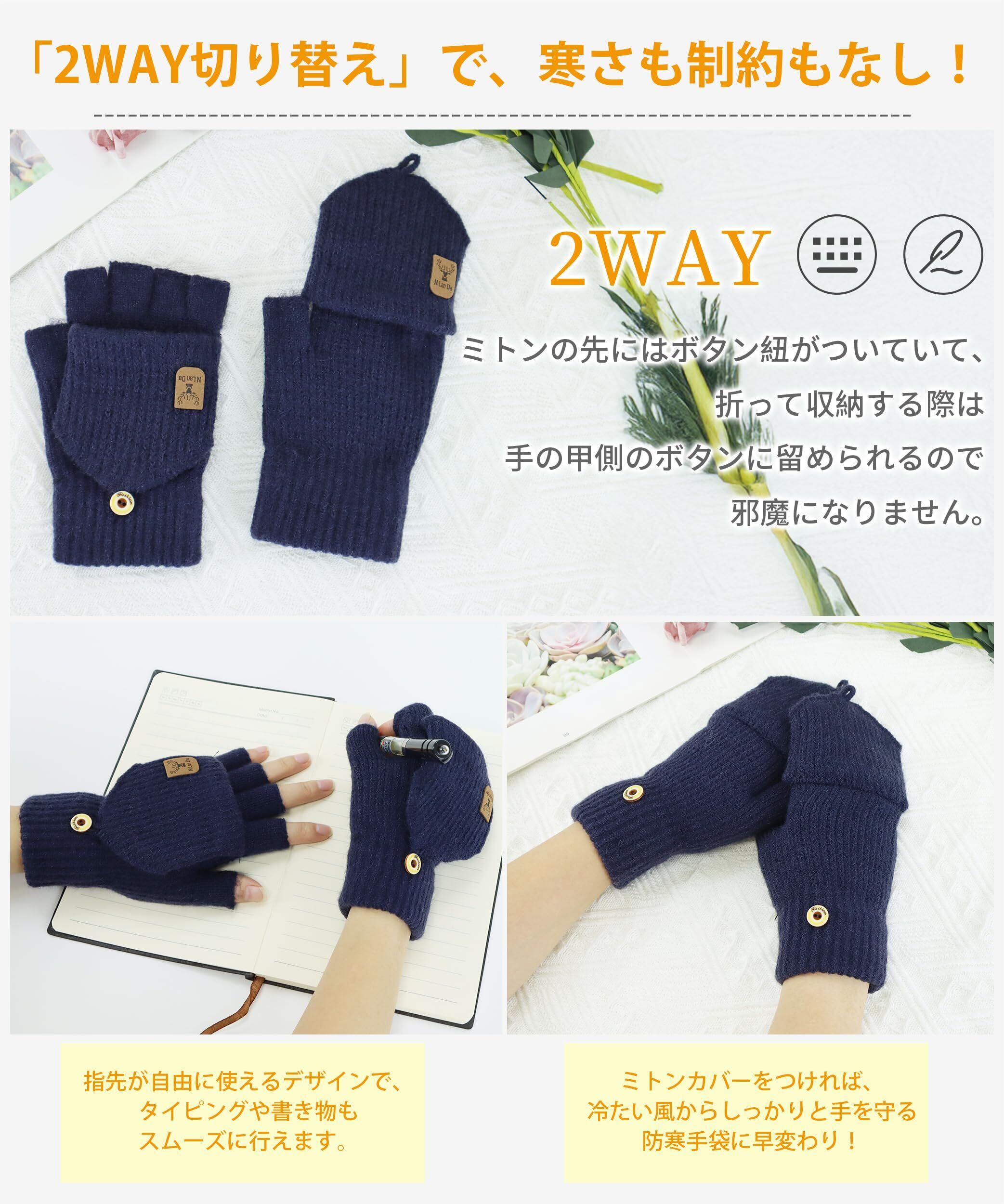 【2way使用の指なし手袋】「自由さ」と「確実な防寒」を両立した防寒手袋です。指なし手袋の最大の利点は、タイピングや筆記のような活動をスムーズに行える点にあり、同時に手の冷えや硬直を効果的に防ぐことができます。また、スマホ対応 手袋としても使用可能です。ミトンカバーが付属しており、これにより屋外での使用が可能になります。自転車に乗る際や通勤時など、ミトンカバーを装着するだけで使用できます。ミトンの先にはボタン紐がついていて、折って収納する際は手の甲側のボタンに留められるので邪魔になりません。