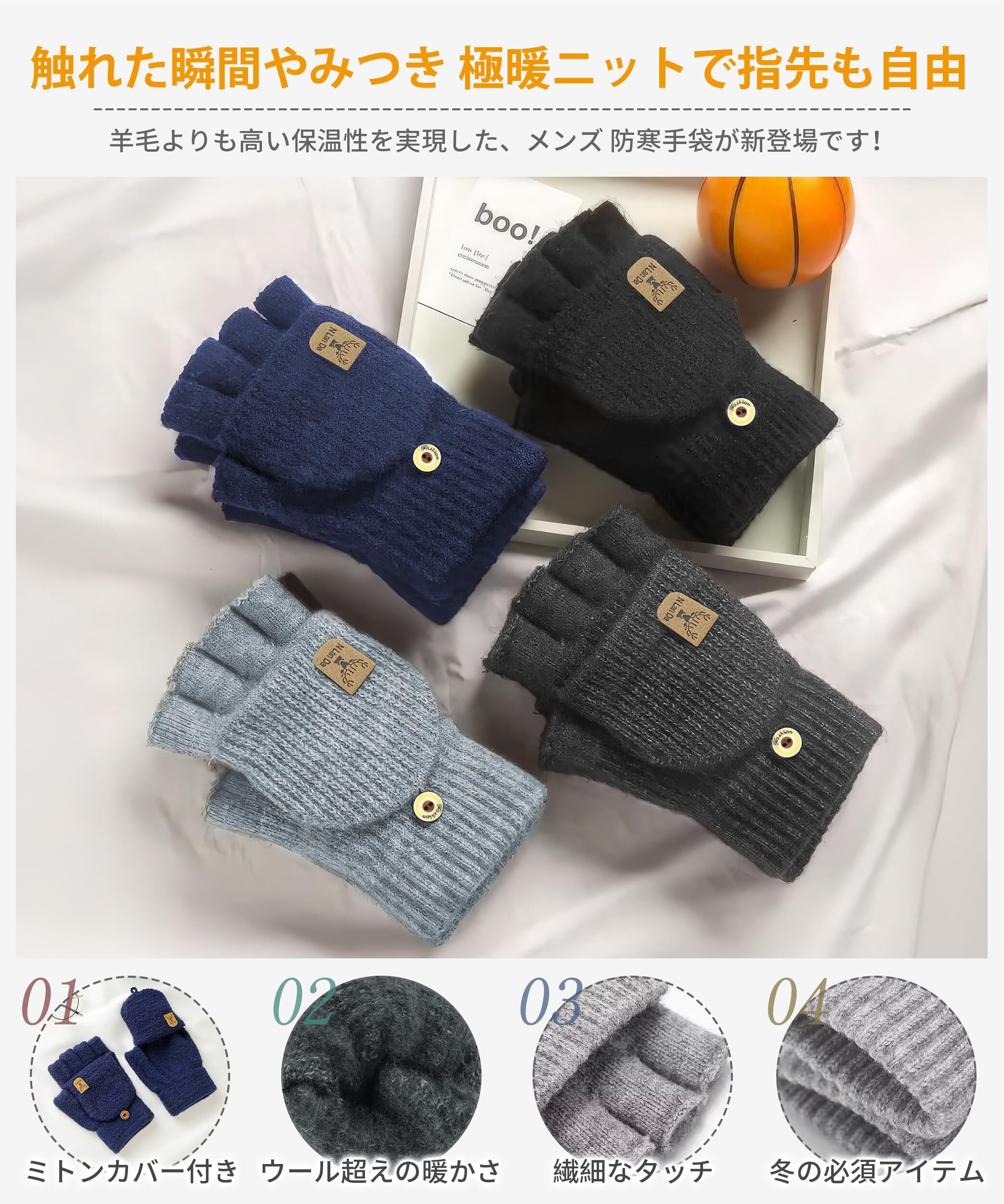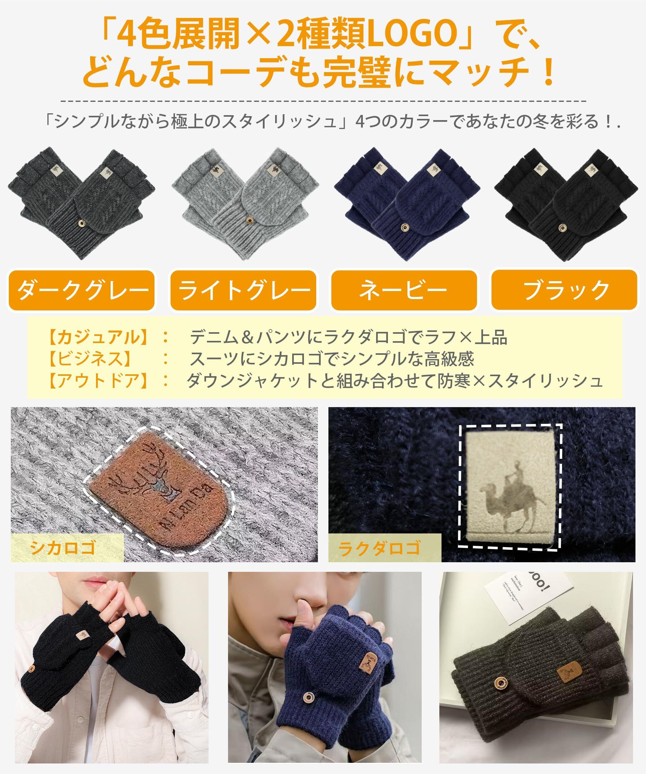 [MOWO] 手袋 メンズ 防寒手袋 指なし 冬 【肌に優しい素材x繊細なタッチ】【ウールよりも暖かい・指先が自由に】 指出し手袋 指無し手袋 ミトンカバー付き 暖かい 柔らかい スマホ対応 指切り 指ぬき ニット製 防寒 ミトン手袋 通勤 通学