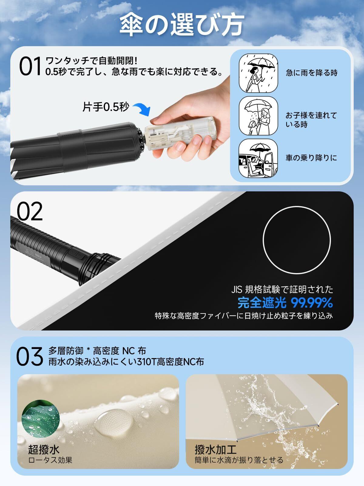 【超強防水・傘カバー付き!ワンタッチ自動開閉傘】この折りたたみ傘は最新技術を搭載!高密度 NC 生地にシームレスデザインで、激しい雨でも瞬時防水し、雨水浸入を防ぎます。収傘時は濡れた面が内側に収まり、軽く振るだけで雨水が落ちるため、飛び散りで人を濡らすハンパさがなく、上下車時のシートを濡らす心配もありません。超吸水傘カバー付きで持ち運び快適!濡れた傘を汚れなく収納,水漏れも心配なく外出できます。ワンタッチで 0.5 秒開閉!子供を抱いたり荷物を持ったりしても手軽に使え、雨天でも安心快適な時間を過ごせます!