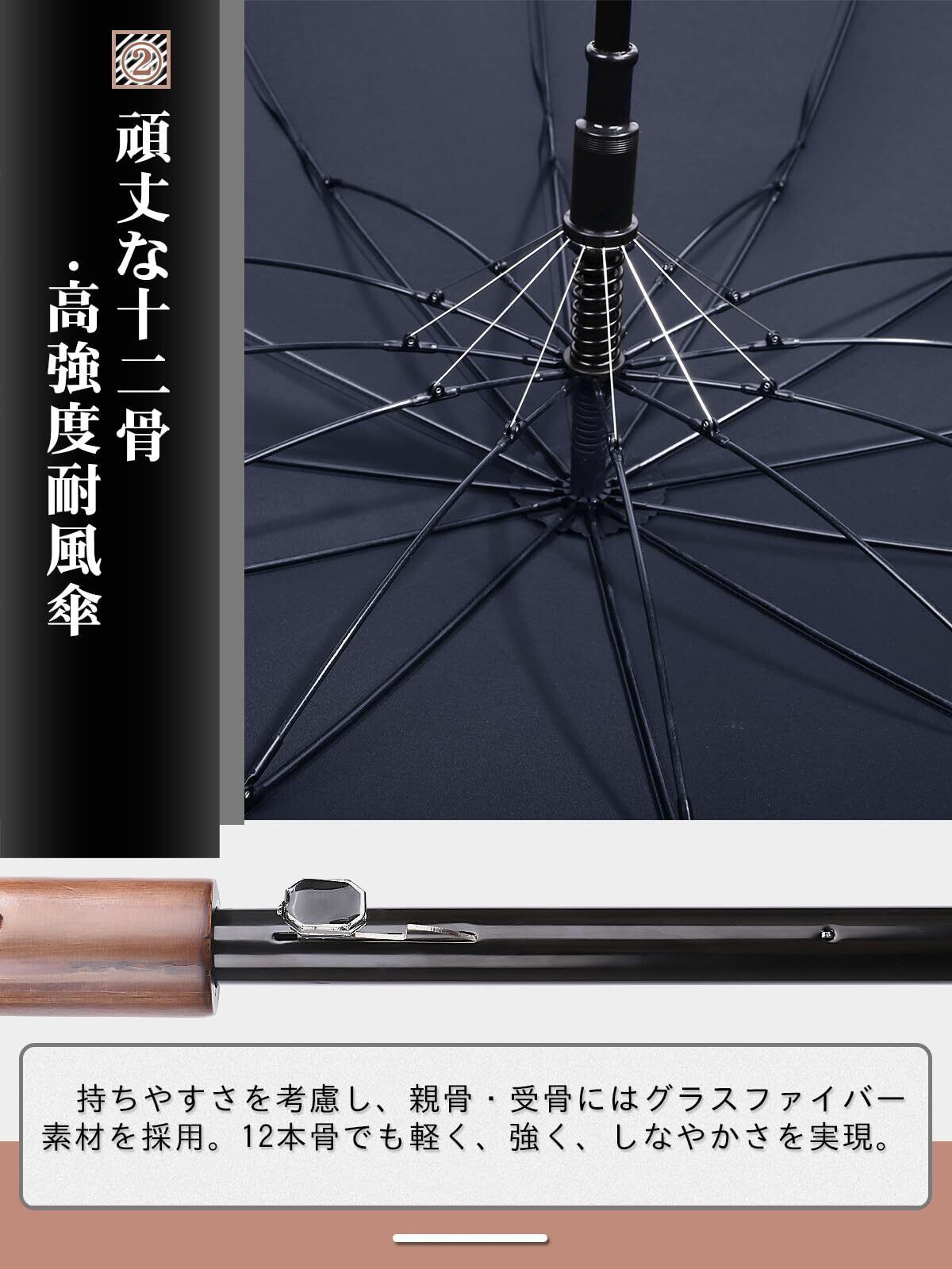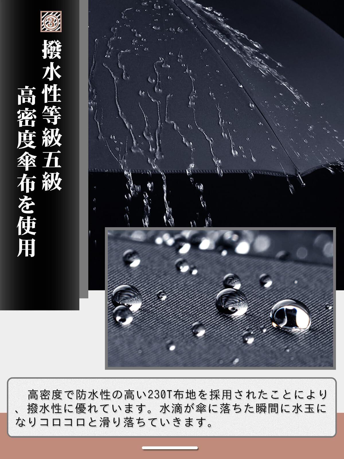 【激しい豪雨&台風対抗の頑丈な12本骨構造】暴風に応対性が強くなるため、骨組みに工夫を凝って頑丈なグラスファイバー製の12本の傘骨を採用しているのおかげで、アルミニウム合金製の傘より優れた耐風性を持っています。強い風でひっくり返っても、開閉スイッチを押したら、骨が曲がることなく、すぐ元通りになります。かなり耐久性に優れ、暴風雨、台風の天候でも容易に割れたり折れたりする心配がありません。耐久性が長くて安心して使える傘になります。