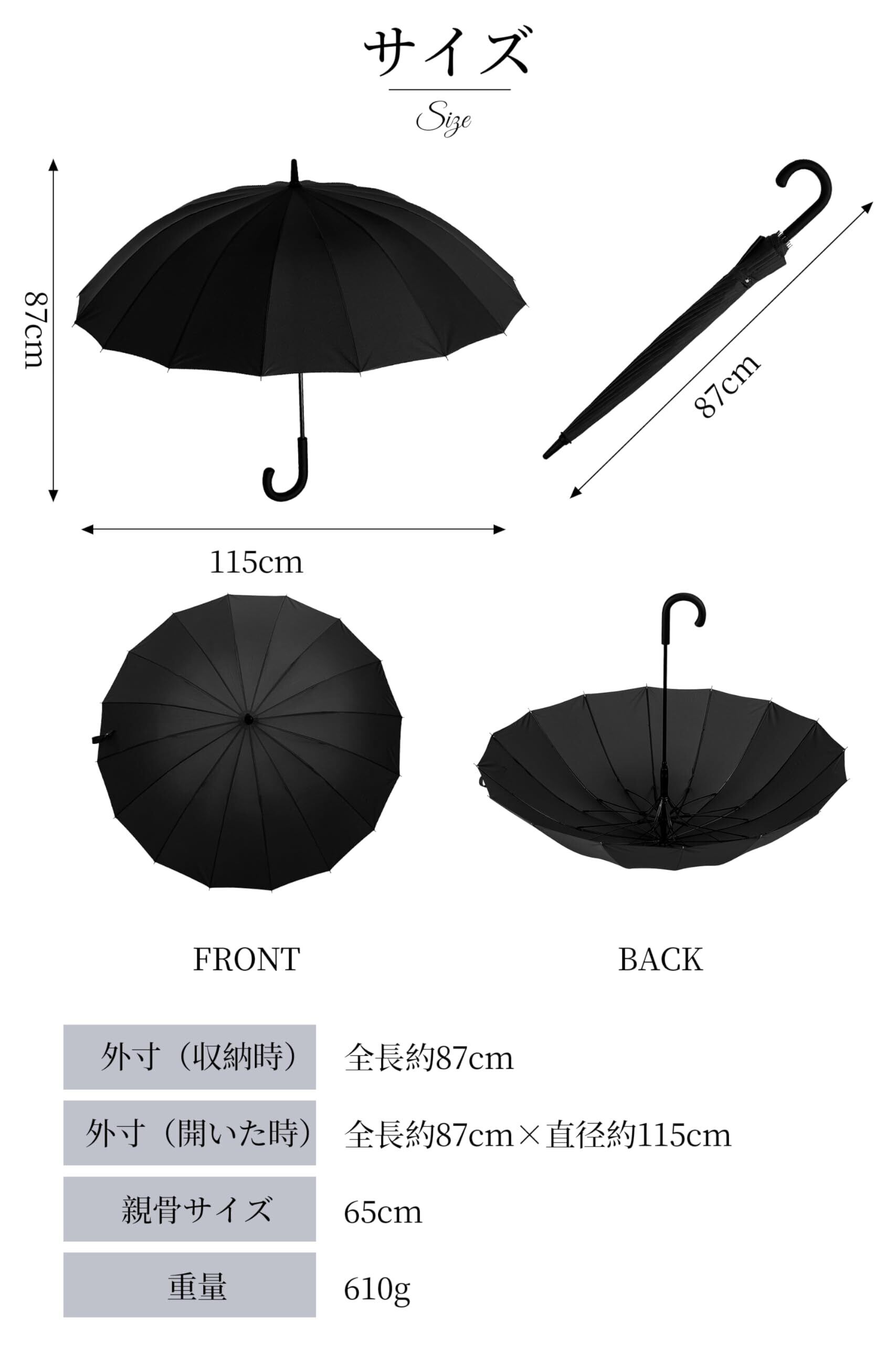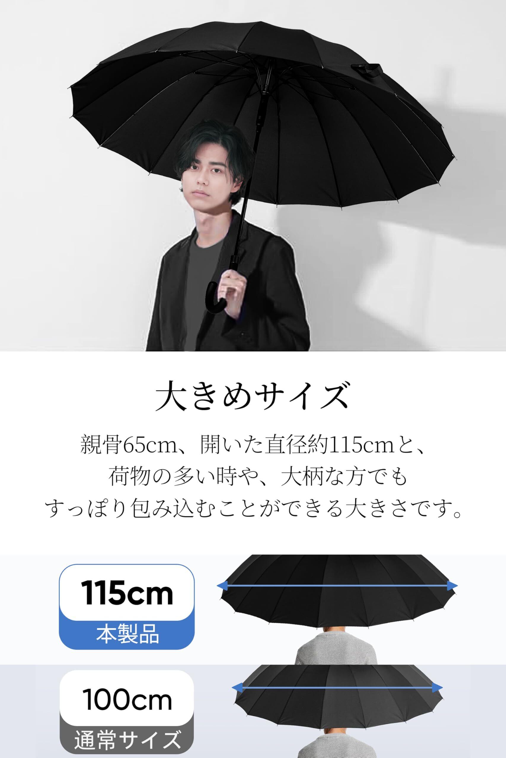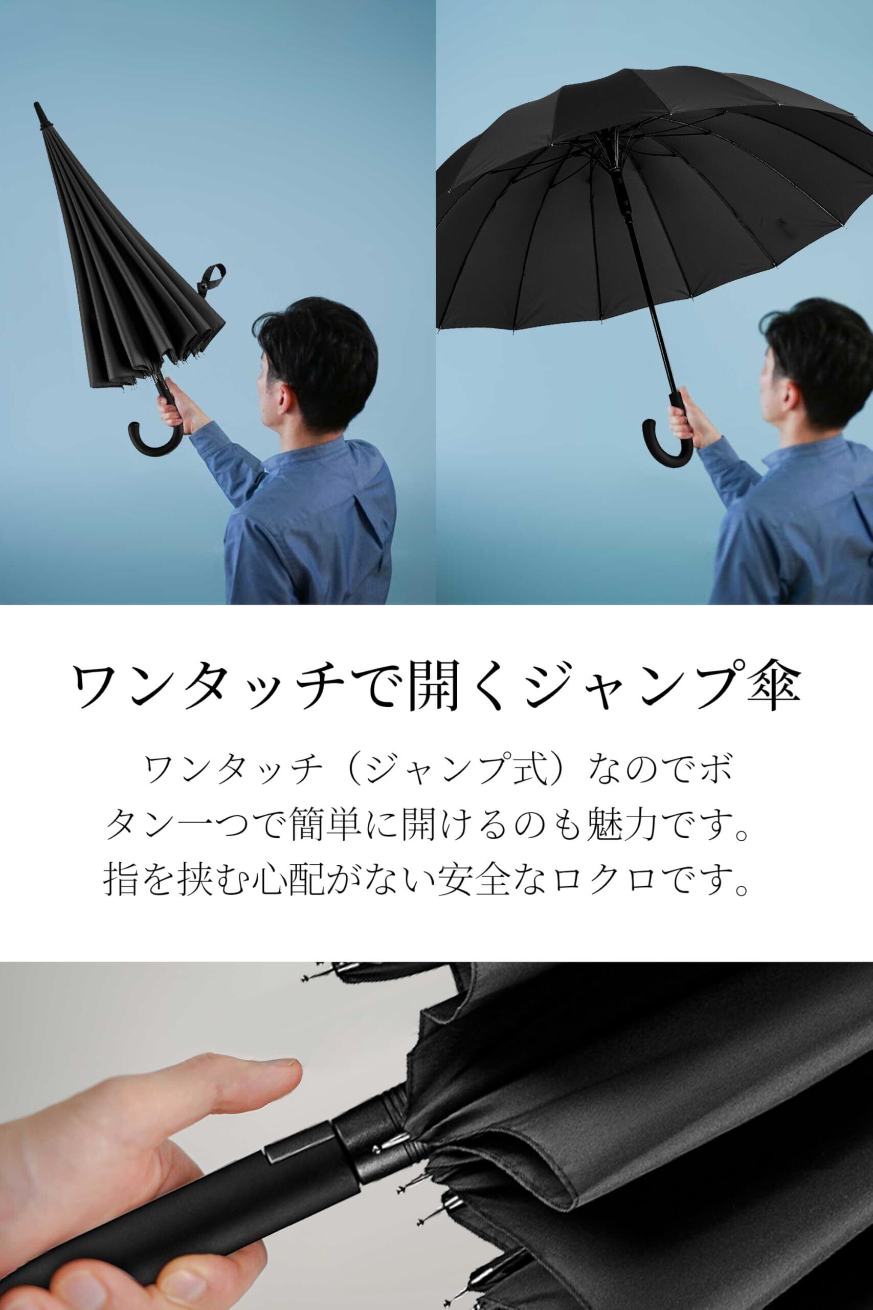 [SUKIO] 長傘 16本骨グラスファイバー 65cm 大人の傘の模範解答 無地 ワンタッチで開くジャンプ傘 超撥水 Teflon加工 晴雨兼用 傘袋付き