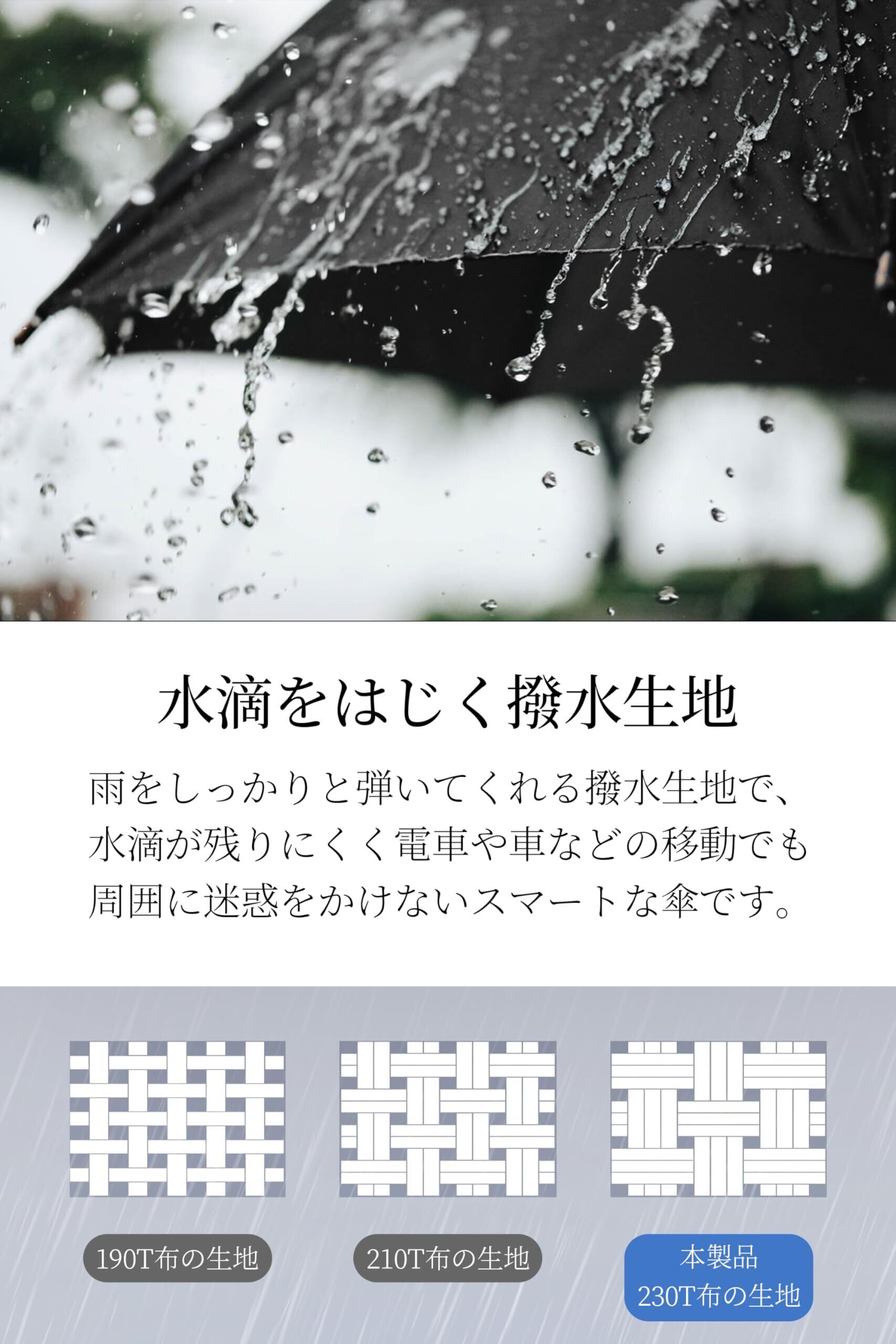 【日傘としても使える晴雨兼用傘】超撥水生地を使用。数回振るだけで瞬時に乾燥します。強力な撥水性と同時に、生地の織り方だけで遮光遮熱99.99%を実現。真夏の日傘としてもお使いいただけます。
