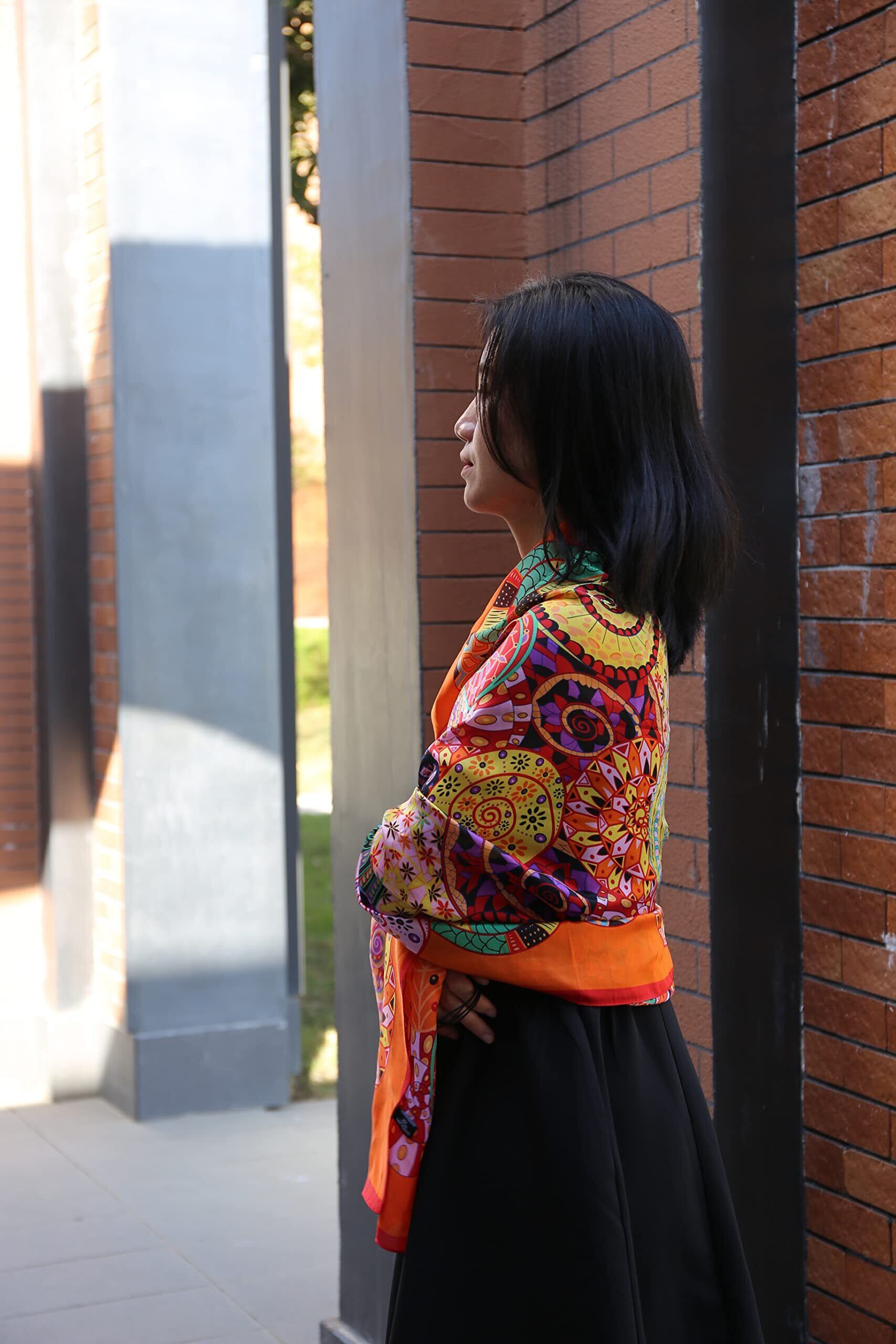 大判でぎらつとした生地で作られたストールスカーフ。肌触りが気持ちよく 首に卷いても、羽織つても丁度いい着け心地。大人可愛いイメージに。いろいろな場面でマルチに使えるアイテムです。