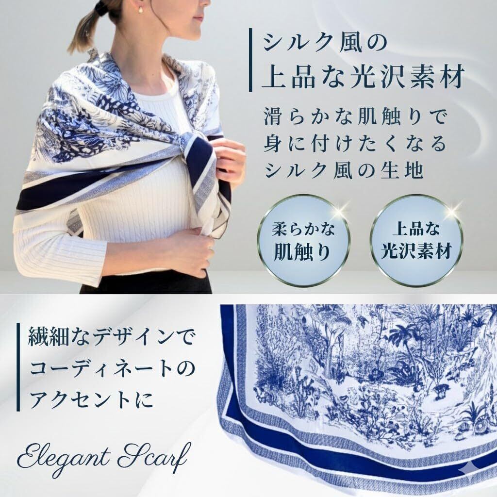 【高級感あふれるシルク風スカーフ】シルクのような上質な光沢と肌ざわりが魅力の大判スカーフ。シンプルな服装やバッグにプラスするだけで、大人の華やかさと品格が漂います。軽やかで通気性もよく、年間を通じて快適に使用できます。