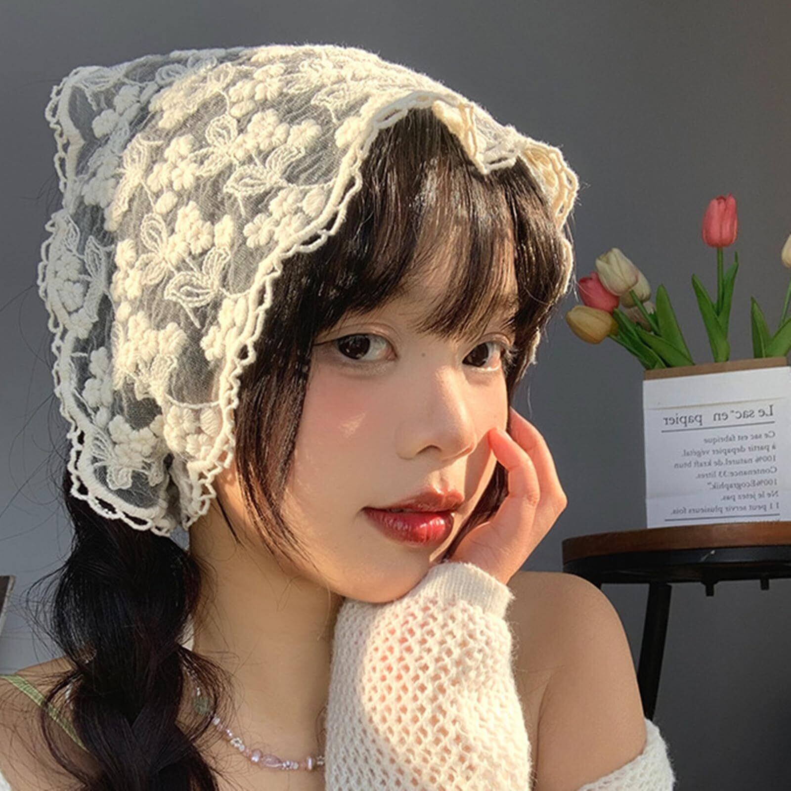 デザイン: 繊細なレース素材と花柄が織りなす上品な白いヘッドスカーフ。