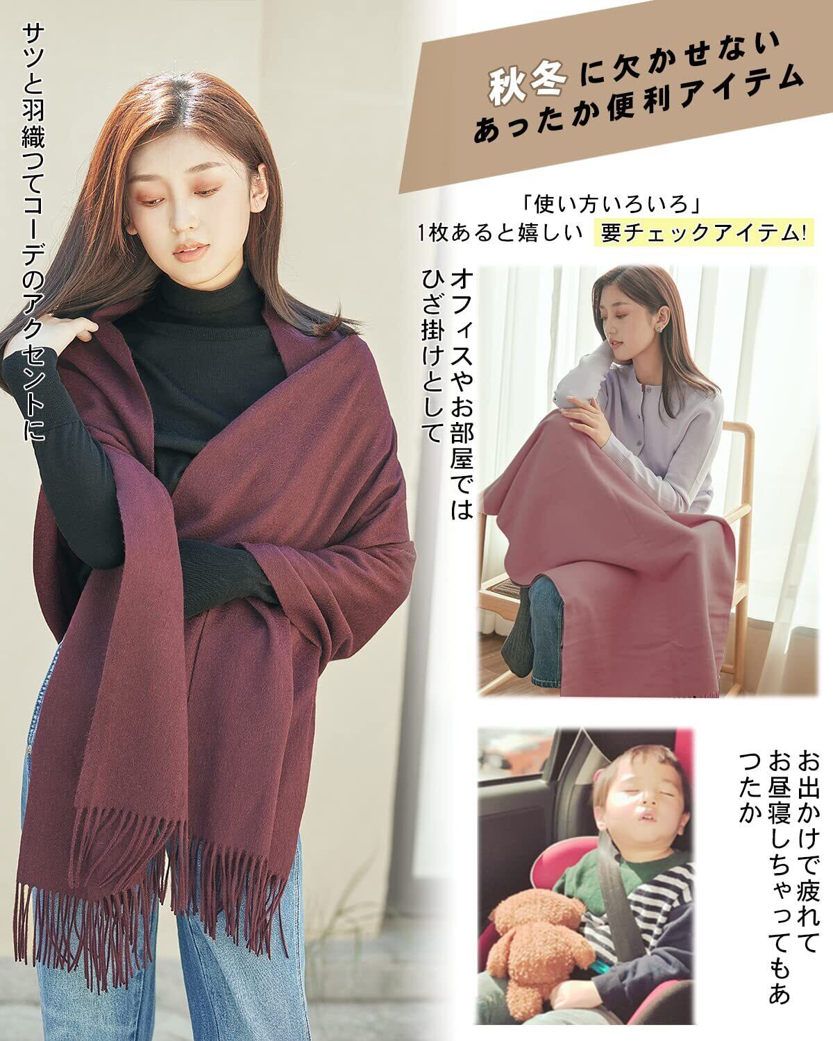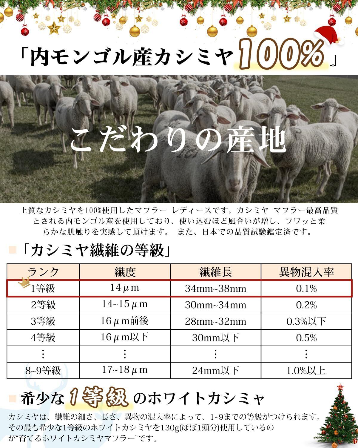 【優れる品質のカシミヤ マフラー】上質なカシミヤを100%使用したマフラー レディースです。カシミヤ マフラー最高品質とされる内モンゴル産を使用しており、使い込むほど風合いが増し、フワッと柔らかな肌触りを実感して頂けます。 また、日本での品質試験鑑定済です。 サイズ(全長)長さ約180cm×幅約30cm(フリンジ10cm × 2含む)。重量約120g ※天然素材を使用しておりますので、サイズや重量に個体差が出る場合がございます。あらかじめご了承の上お買い求めください。