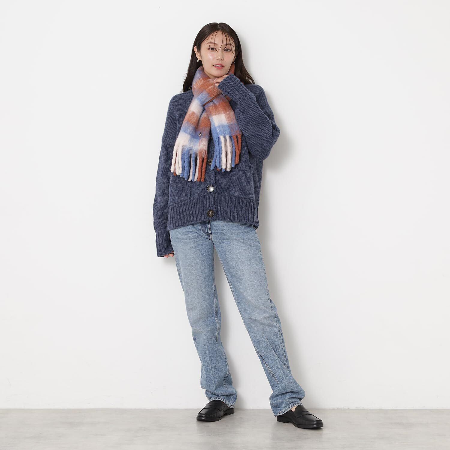 ウール混のふわふわとした風合で心地よい肌触りのマフラーです。ボリューム感があるのにとても軽くて疲れにくいのも魅力。先端を反対側にある通し穴に差し込むだけで、綺麗なシルエットが完成します。