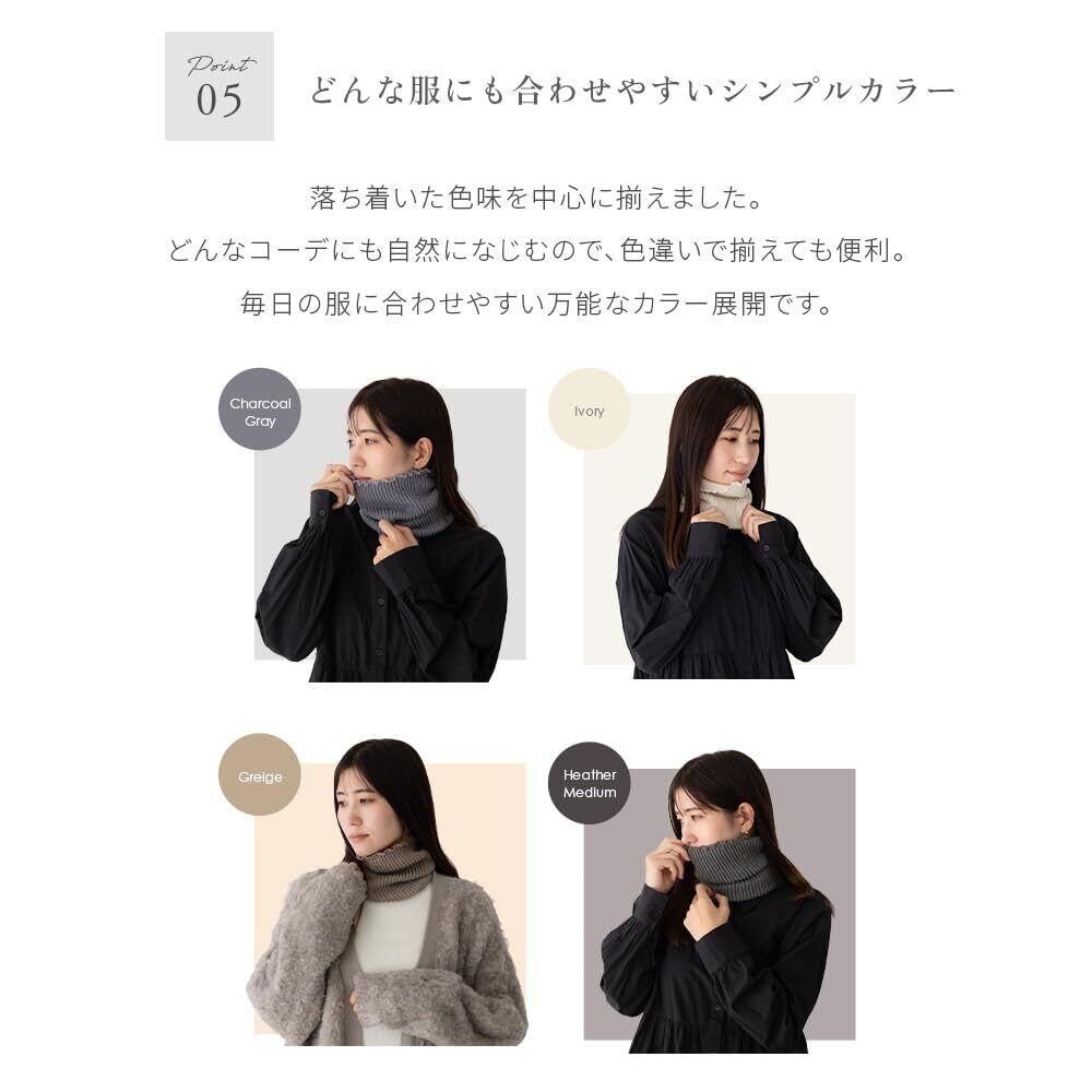 【マフラー代わりに使える、日常性】 屋外の防寒はもちろん、室内で首元が冷える時にも活躍。厚手すぎないため、マフラーが使えない職場や家事中にも便利で、さっと着け外しできる実用性が魅力です。