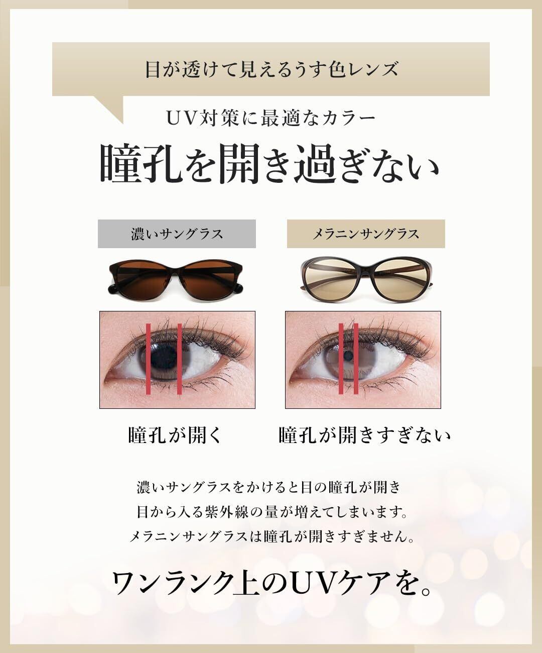 うすいレンズはUV対策に最適:うすいレンズでもUV99%カット。レンズの奥の目がしっかり見えて上品な印象に。サングラス特有の威圧感がありません。