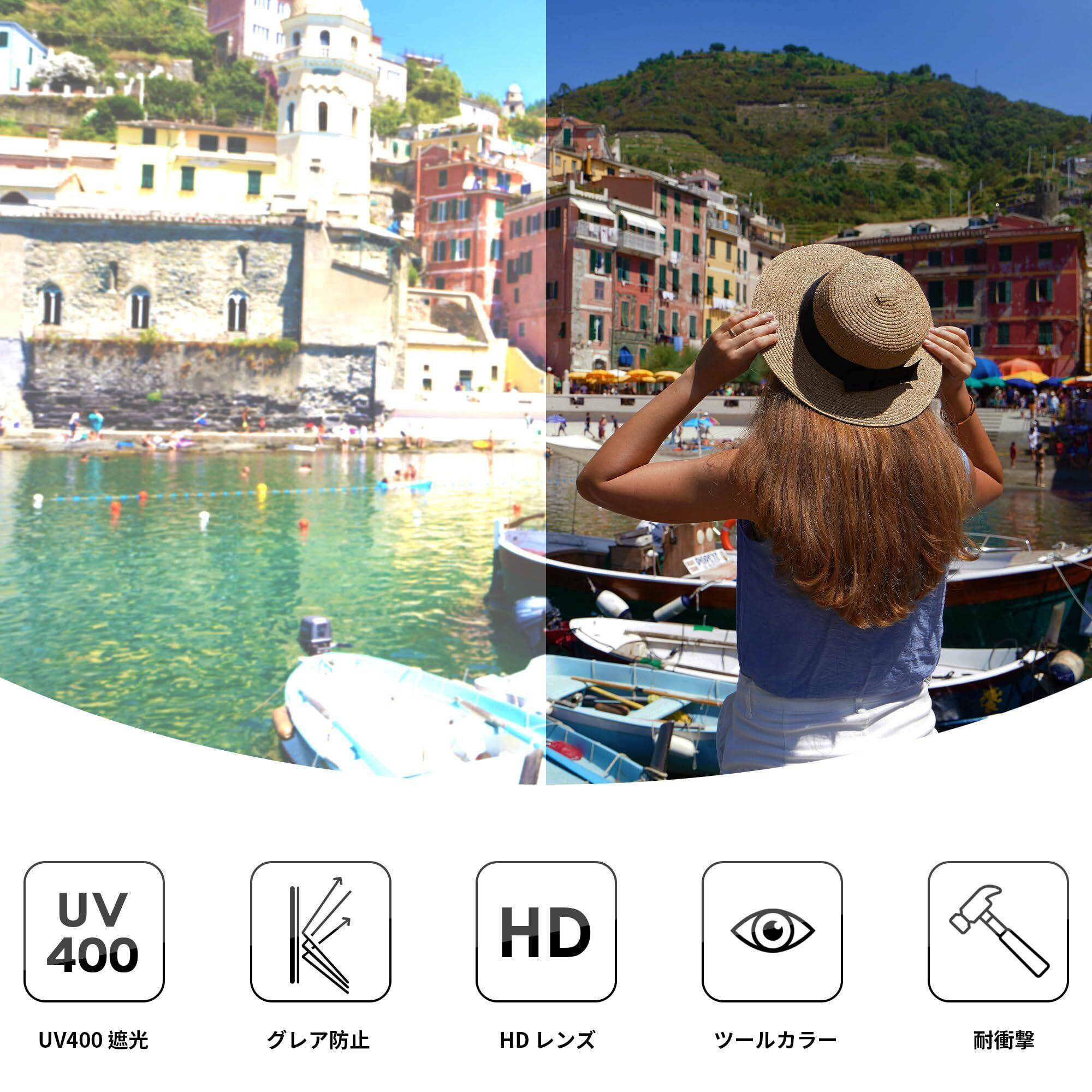 【高品質素材で快適な着用感】プラスチックフレームと樹脂レンズを採用し、UV400 保護機能付き。耐久性のある軽量素材と強化メタルヒンジに加え、幅広の固定型ノーズパッドで長時間の着用も圧迫感なく快適です。