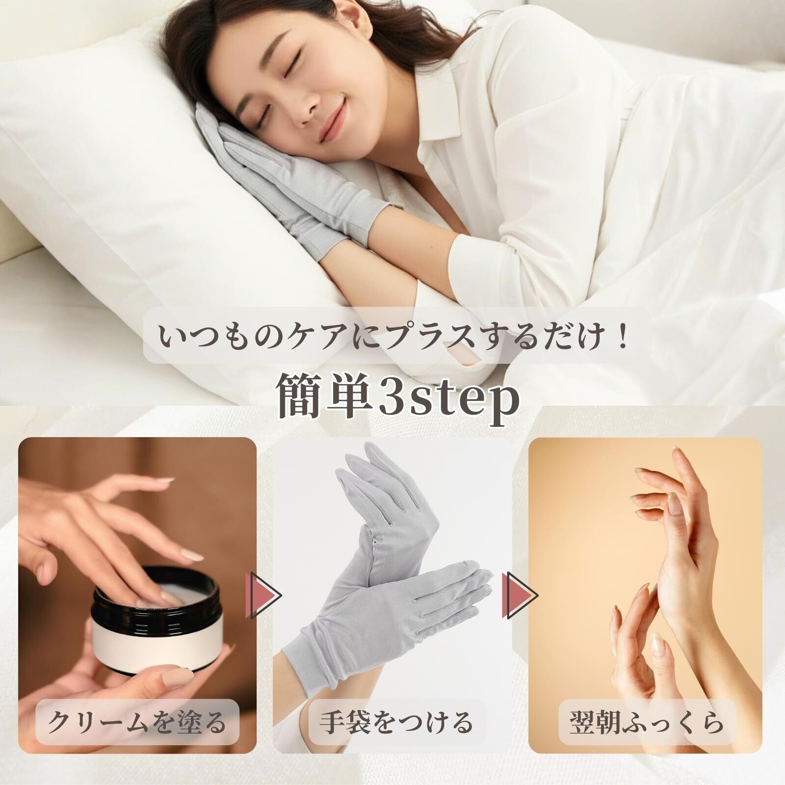 【ハンドケア:】就寝時に着用することで手荒れを防ぎ、保湿クリームの浸透を促進して手肌をしっとり保護。ハンドクリームが布団や衣類に付着するのを防ぎます。