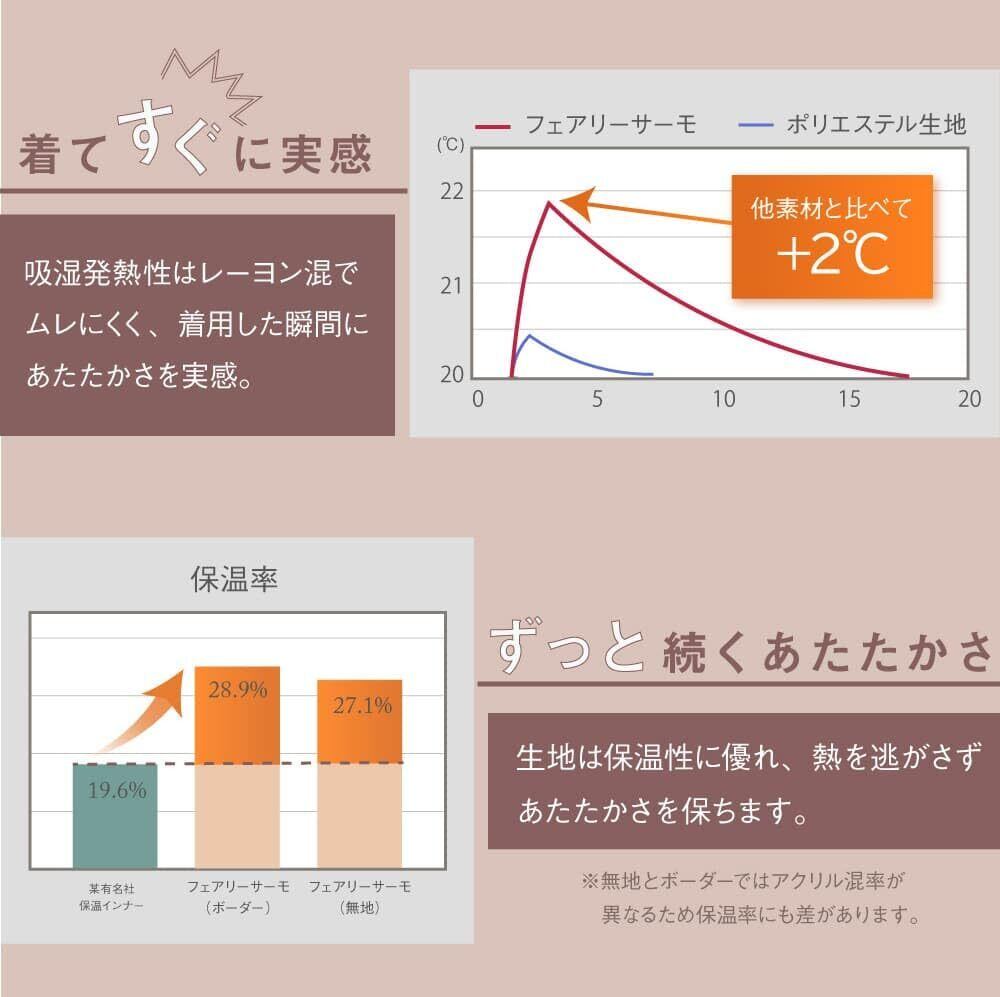 【ポカポカあったか持続】保温性・吸放湿性に優れた、日本製「フェアリーサーモ生地」使用。マイクロアクリルとビスコースレーヨンを掛け合わせたハイブリッド素材が温かさを持続します。