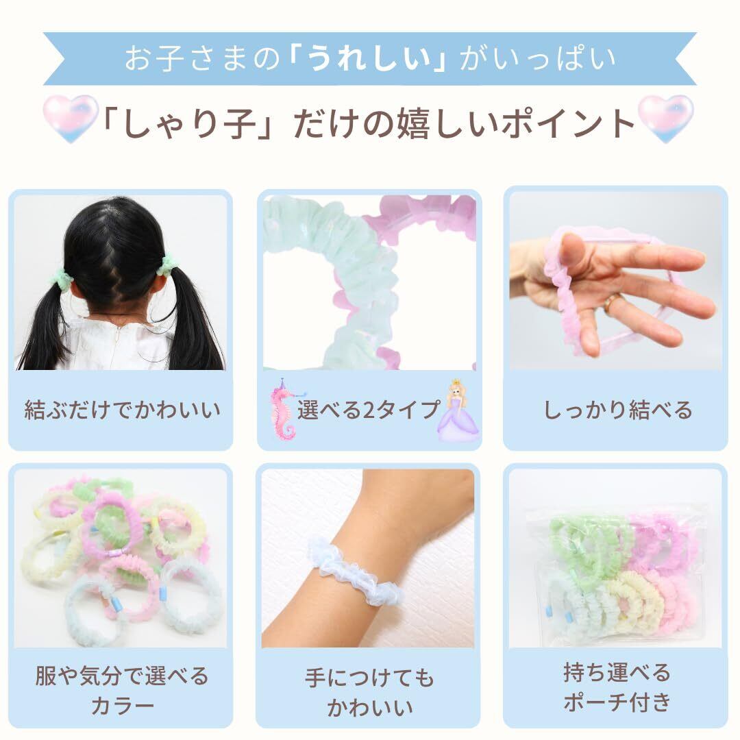 【ふんわり透け感が可愛いプリンセス&マーメイドカラーの”しゃり子”】 「パステルカラーで優しい雰囲気のヘアゴムが欲しい!」 そんな声に応えて誕生したのがしゃり子。 淡くてやさしい色合いと、透け感のあるしゃりっと軽やかな素材感で、結ぶだけで一気に華やかな印象に。