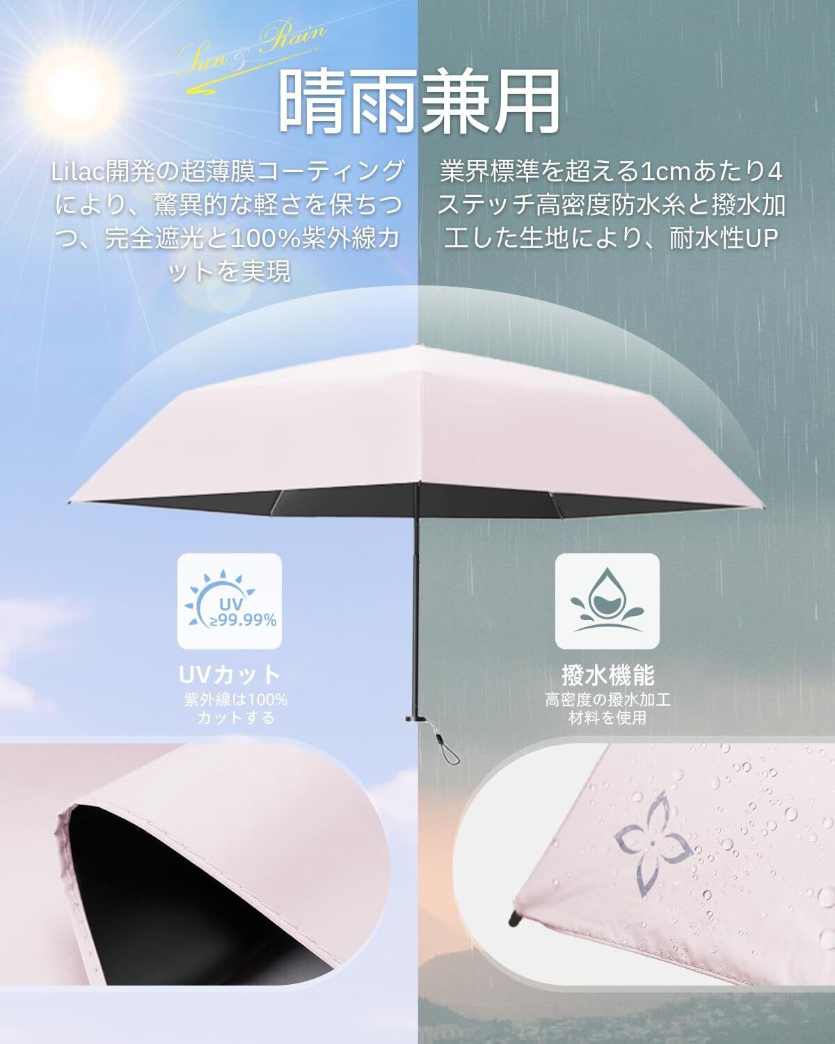 【JIS認証 105g 超軽量】Lilac おりたたみ傘 日傘 軽量 100%UVカット 100%遮光 晴雨兼用 完全遮光 遮熱 耐風 携帯便利 撥水加工 おしゃれ 可愛い レディース メンズ 傘袋付き 熱中症対策 プレゼント