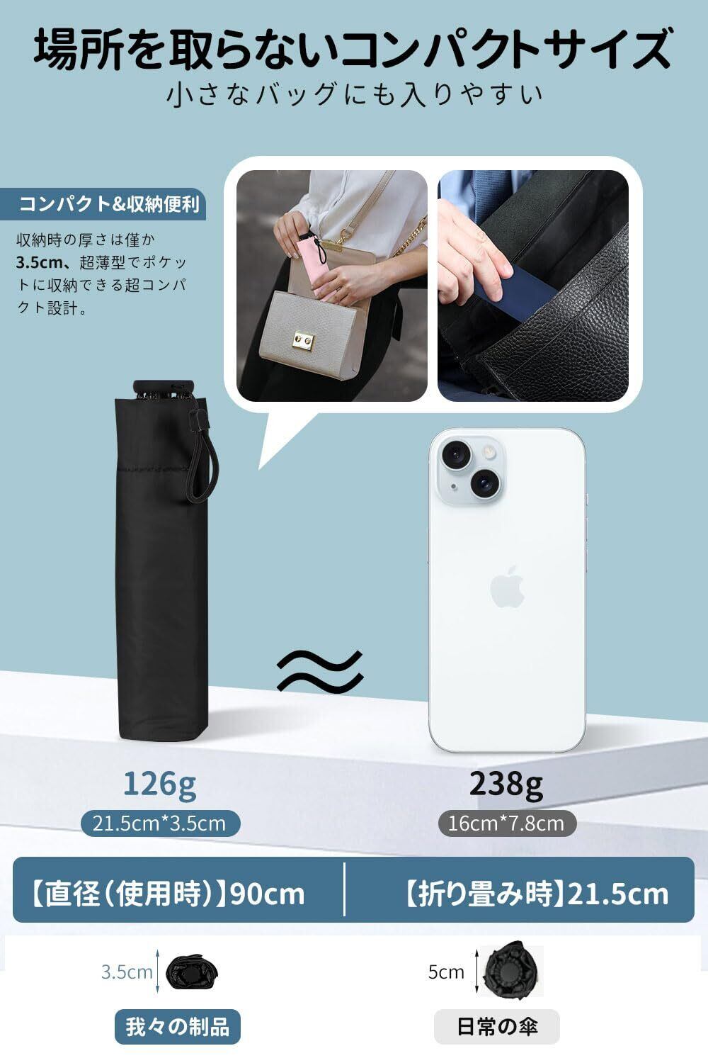 【超軽量・コンパクト折り畳み日傘】カーボンファイバーとアルミ合金を使用した、軽くて丈夫な折り畳み日傘です。最適化された構造により、通常より軽量化されており、重さはわずか126g 直径90cm。折り畳むとたったの3.5cmと非常にスリムなサイズなので、バッグに収納してもかさばりません。毎日通学や通勤などで持ち歩いても負担にならず、夏フェスやスポーツ観戦、ライブ、野外イベント、キャンプ、登山、旅行など、屋外での活動にぴったりな暑さ対策グッズです。