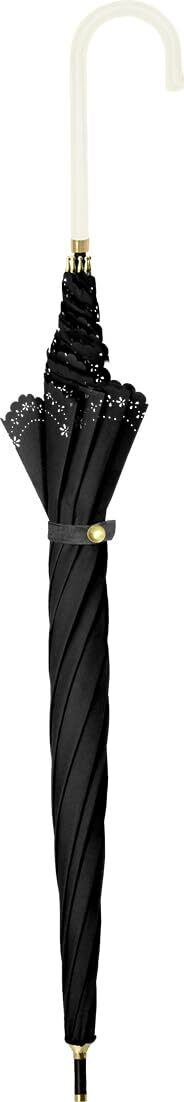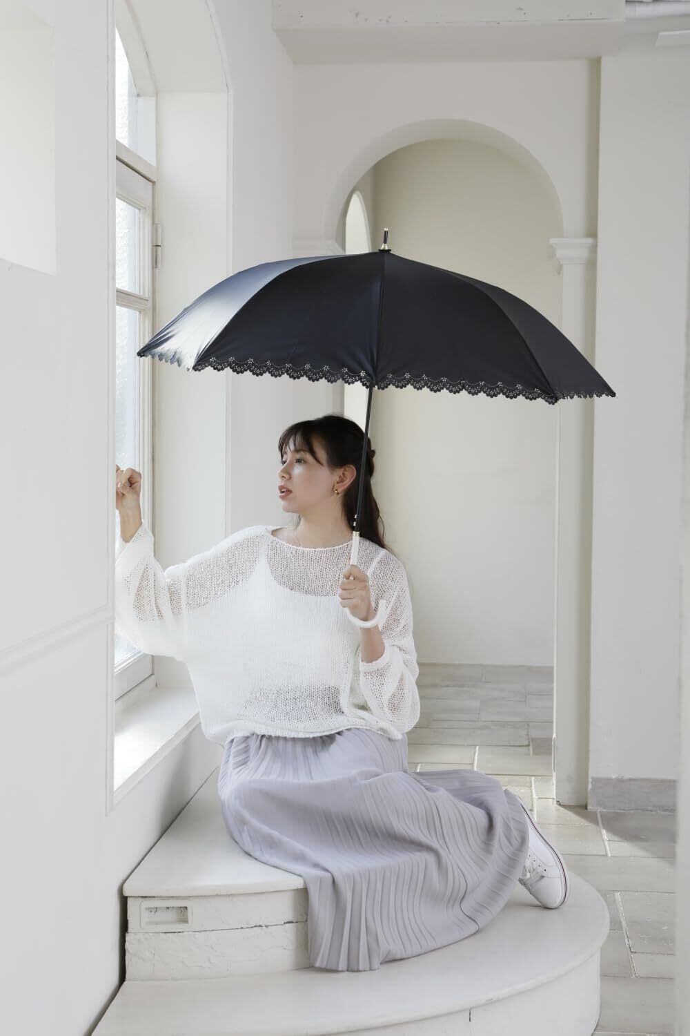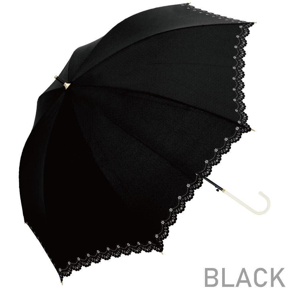 裾の花柄ヒートカットがかわいい、シンプルで上品なデザインです。58cmの大きめサイズが日差しから肌を守ります。親骨は、風に強くしなやかで折れにくいグラスファイバー骨仕様です。遮蔽率99.9%、遮熱効果30%cut、UPF50+、遮光率100%