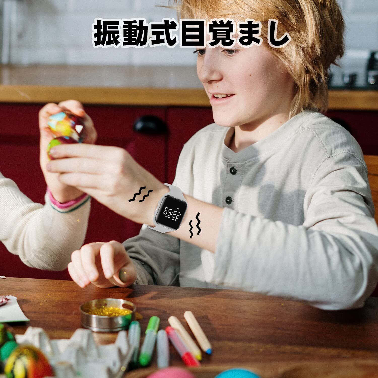 [振動式目覚まし時計]:充電式 うで時計は振動目覚まし時計を採用しており、腕に振動を感じさせる腕時計。静かにしたい場合には、この目覚まし時計のデザインがぴったり。他の人の邪魔になる心配もなく、教室や図書室、アウトドアなどでの使用にも最適。