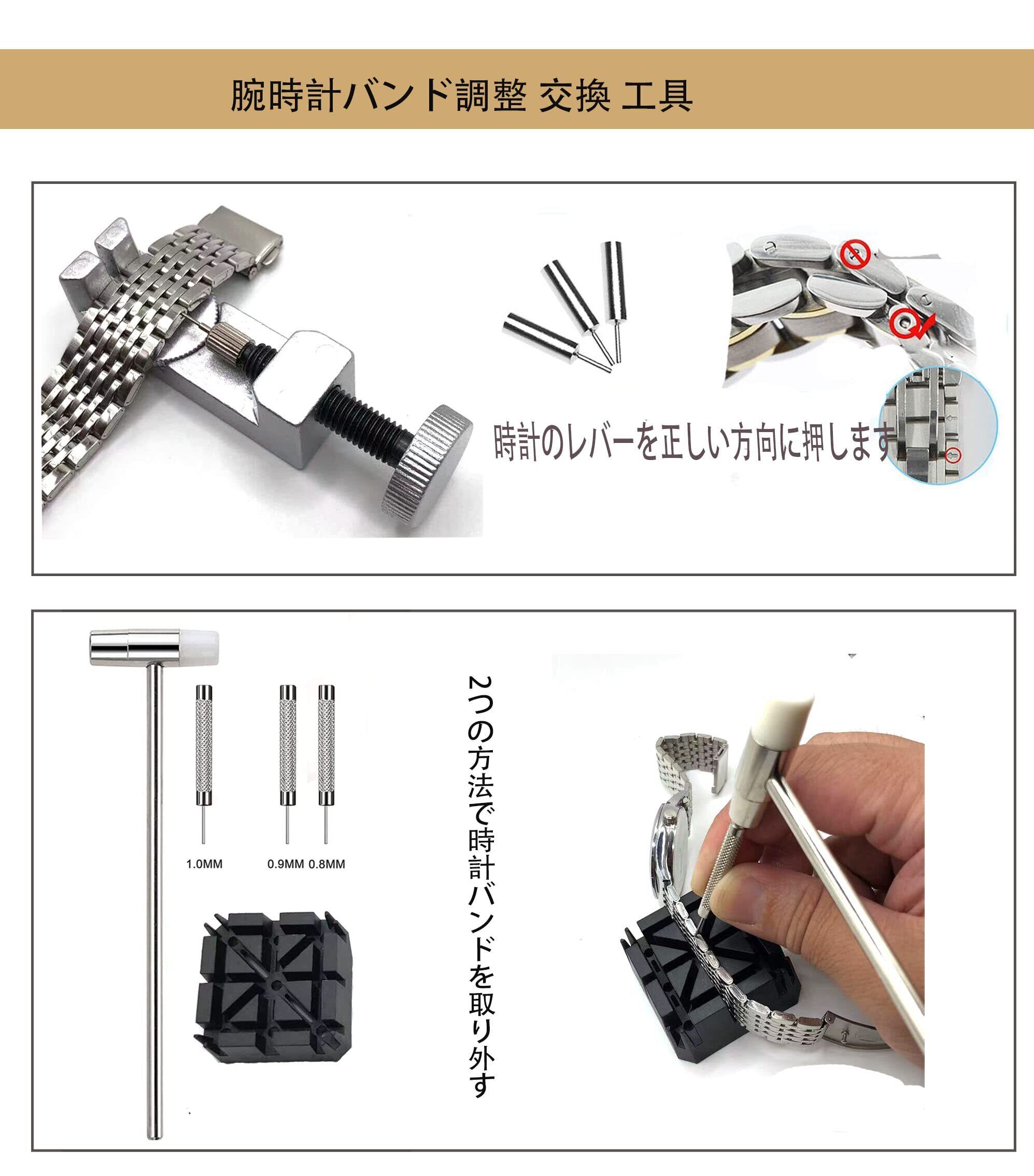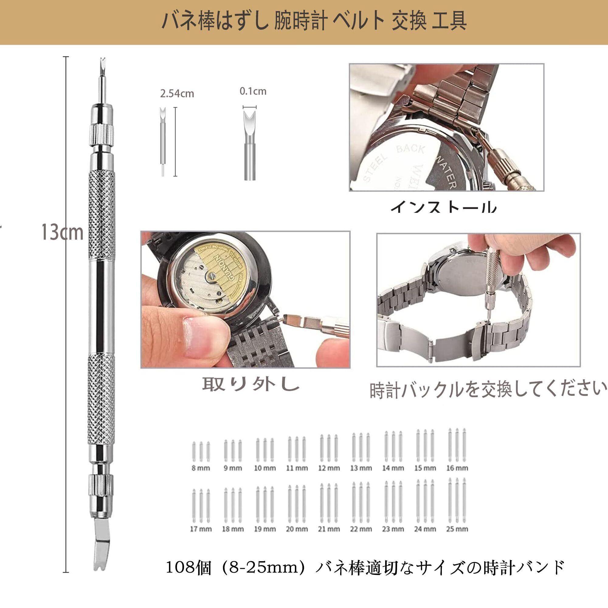 【腕時計バンド調整 交換】 時計修理 工具セット,バンドがスプ バネ棒 で固定されていれば、どんな材質のバンドにも交換できます。革、ステンレス、シリコンなどの材質で、108 サイズのスプバネ棒が付属します,時計 工具さまざまなサイズのバンドを交換することができます、長さ調整ツール、バンドを適切なサイズに調整する