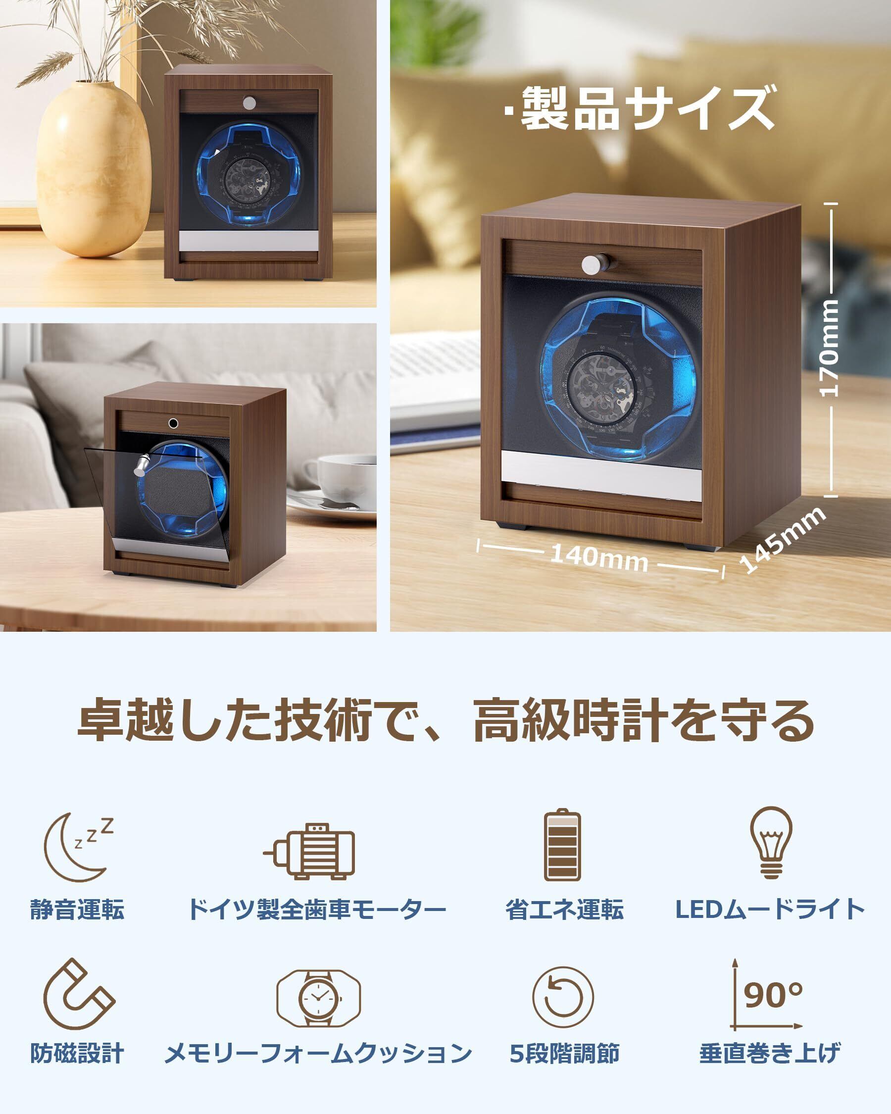高級木目調ワインディングマシーン、PHIZTO 自動巻きケース 5モード回転 腕時計ワインダー 単一ポジション LEDライト搭載 静音かつ省エネ運転 全ての男女向け機械式時計に対応 充電器または家庭用電源に接続可能 USBケーブル付属 保護布 ユーザーガイド