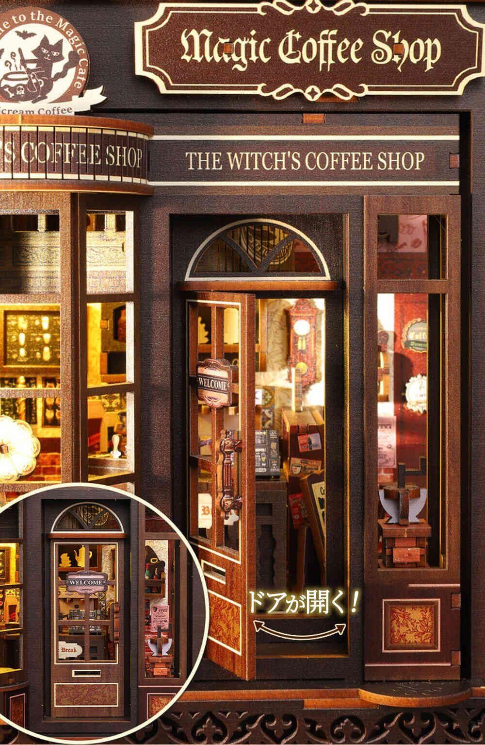 【 小さなコーヒーショップをあなたの手で 】 魔法の世界を舞台にしたドールハウスキット。カウンターのランプや手挽きミル、魔法書まで、すべて自分の手で組み立てる楽しみ。コーヒーの香りが漂うような温かい雰囲気と、ファンタジーの魔法が融合した唯一無二のカフェです。