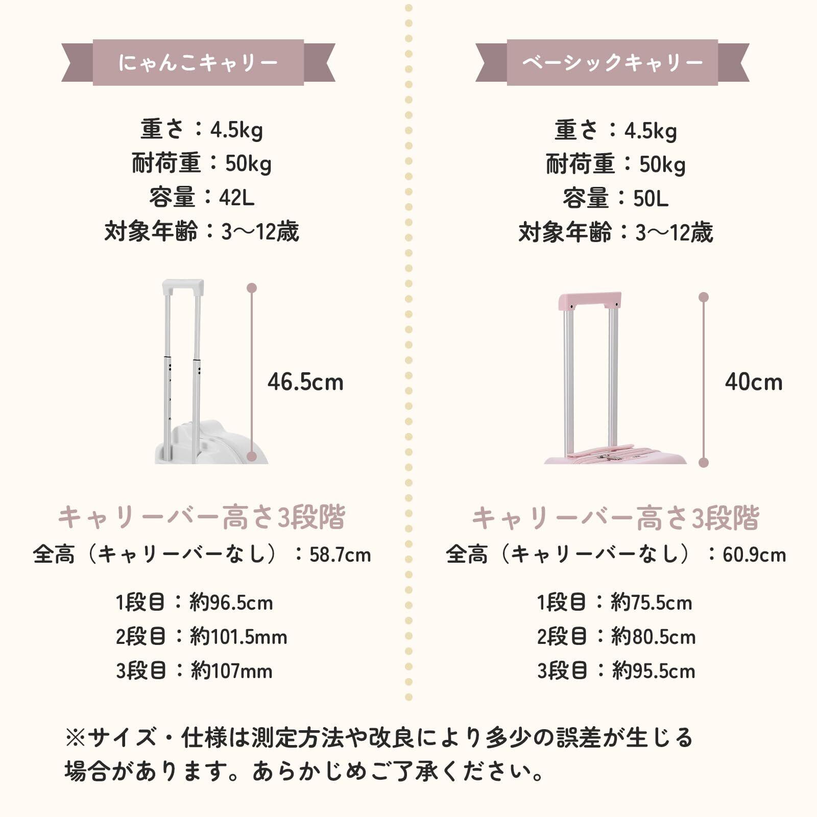 商品仕様:①にゃんこきゃりー(白)【容量】42L【サイズ】約 幅35 × 奥行58 × 高さ58.7cm【重量】4.5kg、②ベーシックキャリー【容量】50L【サイズ】約 幅33.7 × 奥行58 × 高さ59 cm【重量】4.5kg