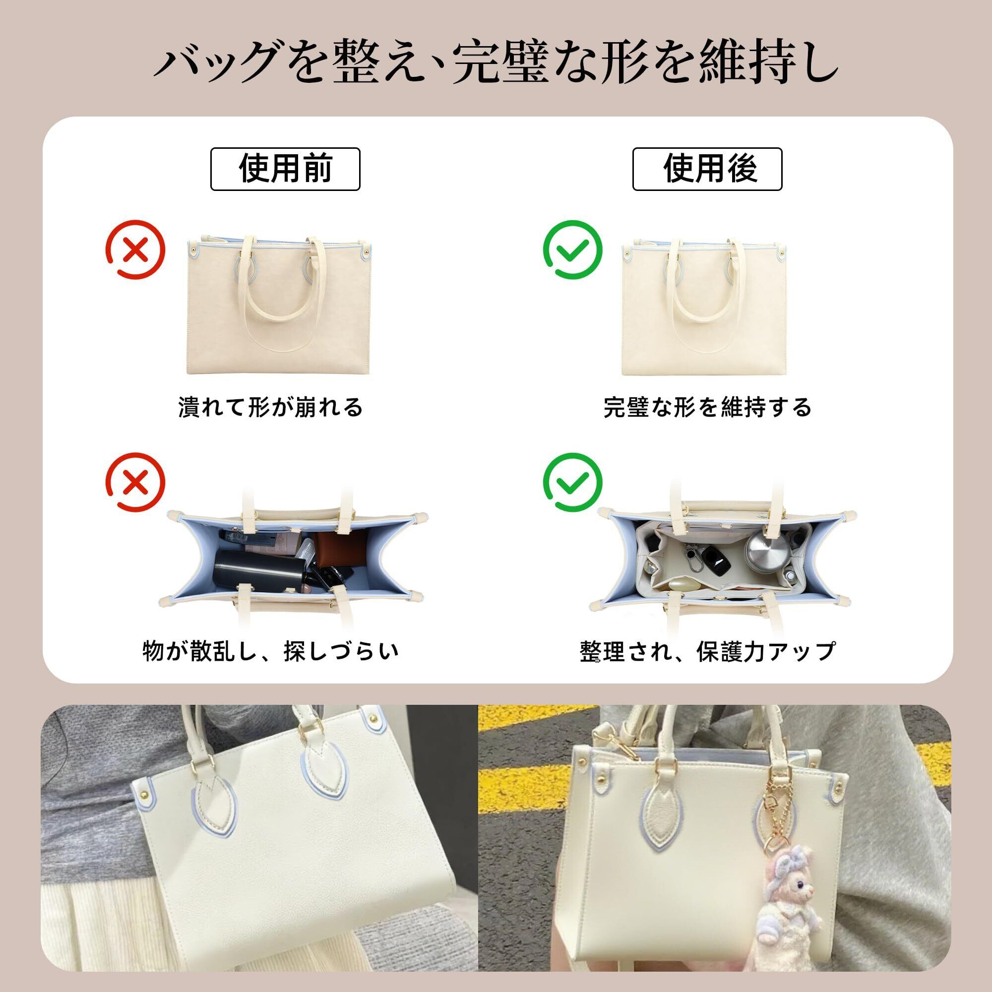 【1つに複数パック対応できる】このインナーバッグはたくさんなバッグタイプに対応しています。大容量のトートバッグ、エレガントなハンドバッグ、それともリラックスしたショルダーバッグでも、完璧にマッチして、1 つのバッグで実用的です。1 秒でカバンを取り替えられるため、カバンの中身を再整理する必要がありません 。複数ご愛用バッグ収納の最高のパートナーです。