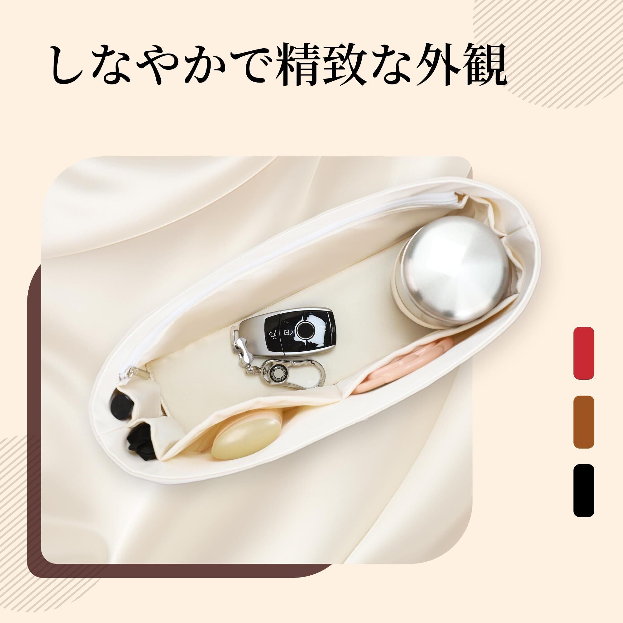 【底版付きと筒状物品固定ラインで高安定性】底版が底部の撓みを防ぎ、全体的な安定性を高めます。加えて、コップや筒状化粧品を固定できるラインが施され、持ち運び中も物品が安定。収納物をしっかり保護し、バッグの形状保持に役立ち、日常使用を便利にサポートします。